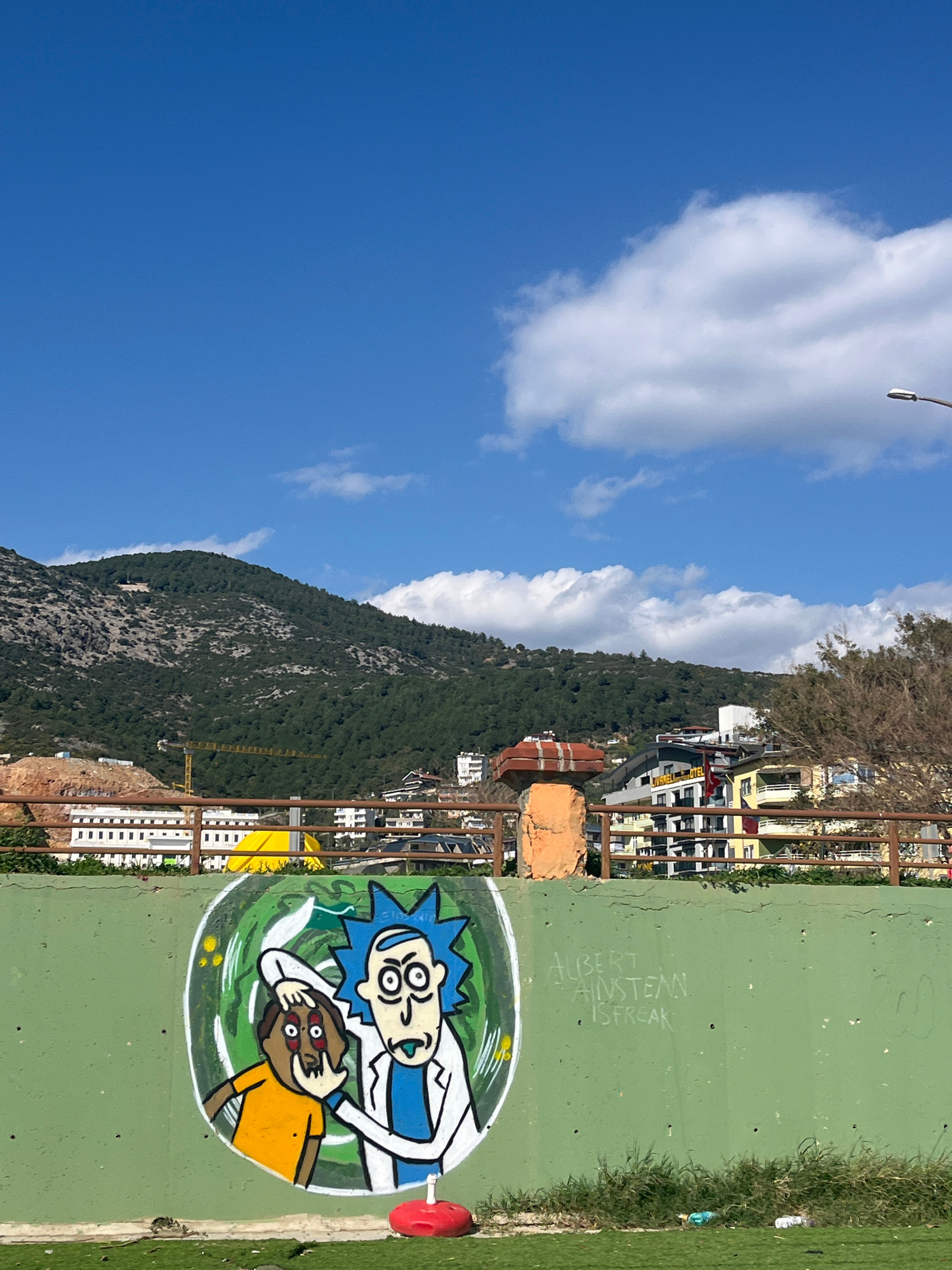 A vertical, eye-level shot captures a green wall adorned with a graffiti-style cartoon depiction of Rick and Morty. The background reveals a daytime view, encompassing a clear blue sky, a cloud format…read more