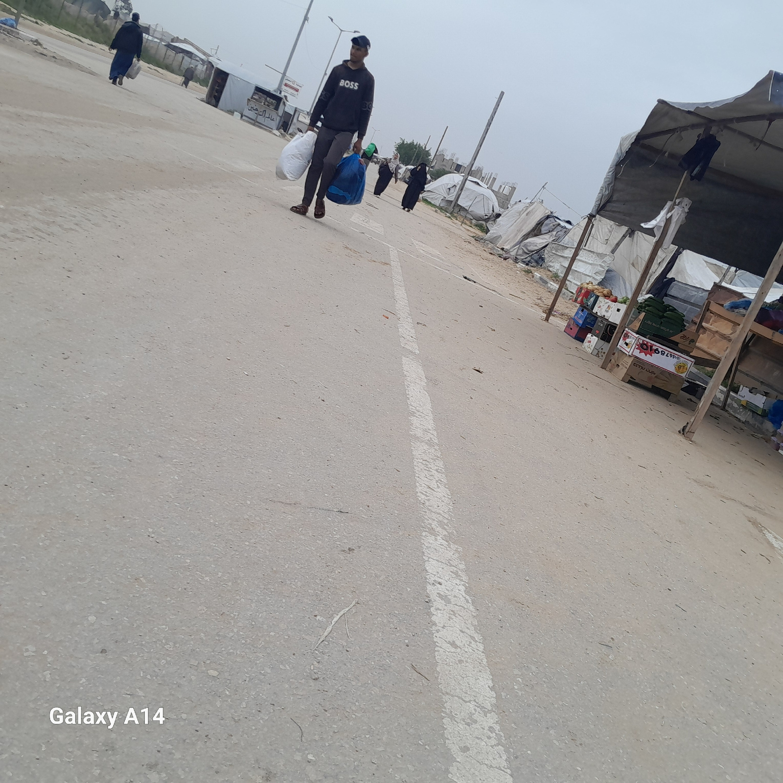 The image shows a street in Khan Yunis, Palestinian Territory. The street is paved and has a white line marking the center. There are several people walking along the street, carrying bags. Tents and…read more