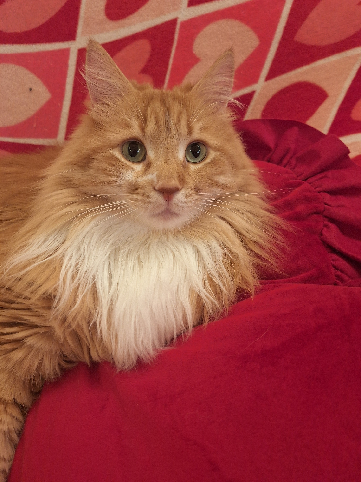 A ginger and white long-haired cat lies on a red-and-pink patterned surface, with its head angled towards the viewer. It is nestled against a red fabric or pillow with gathered detailing. The cat has…read more