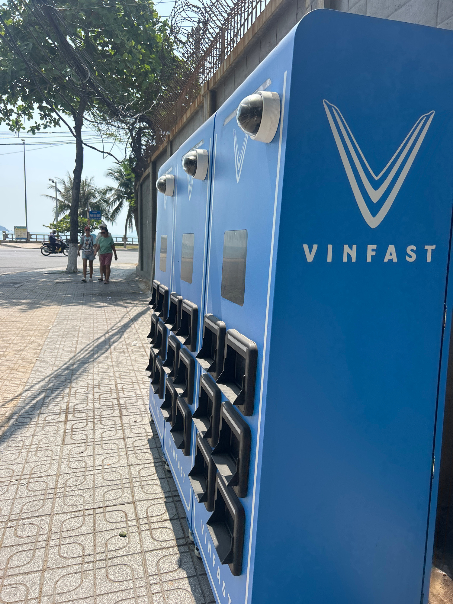 The image depicts an outdoor scene in Bắc Nha Trang, Vietnam, on a bright, sunny day, suggested by the clear sky and pronounced shadows. A large, blue battery swapping station, prominently featuring t…read more