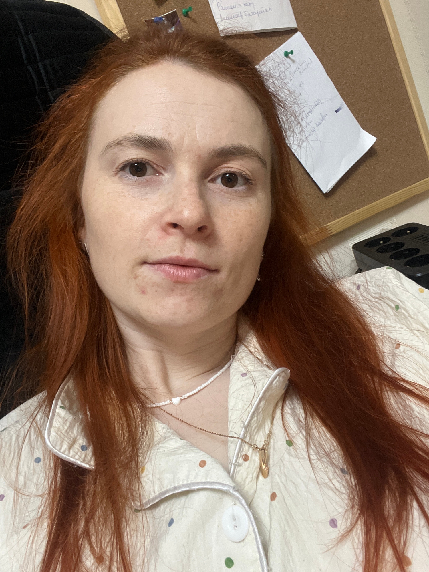 A selfie of a light-skinned woman with red hair. She is lying on a bed wearing a cream-colored pajama top with blue and brown polka dots, a white collar, and white buttons. She is also wearing a white…read more