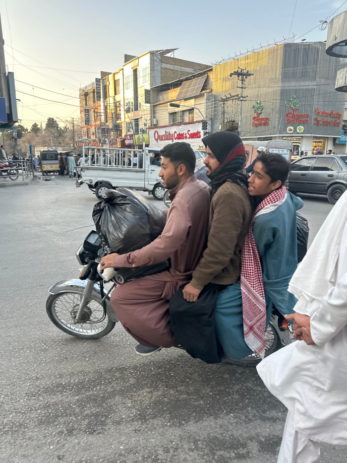 A roadside scene in Quetta City Tehsil, Pakistan, depicts three males on a silver motorcycle traveling on a grey asphalt street. The driver, an adult male wearing a brown shalwar kameez, operates the…read more