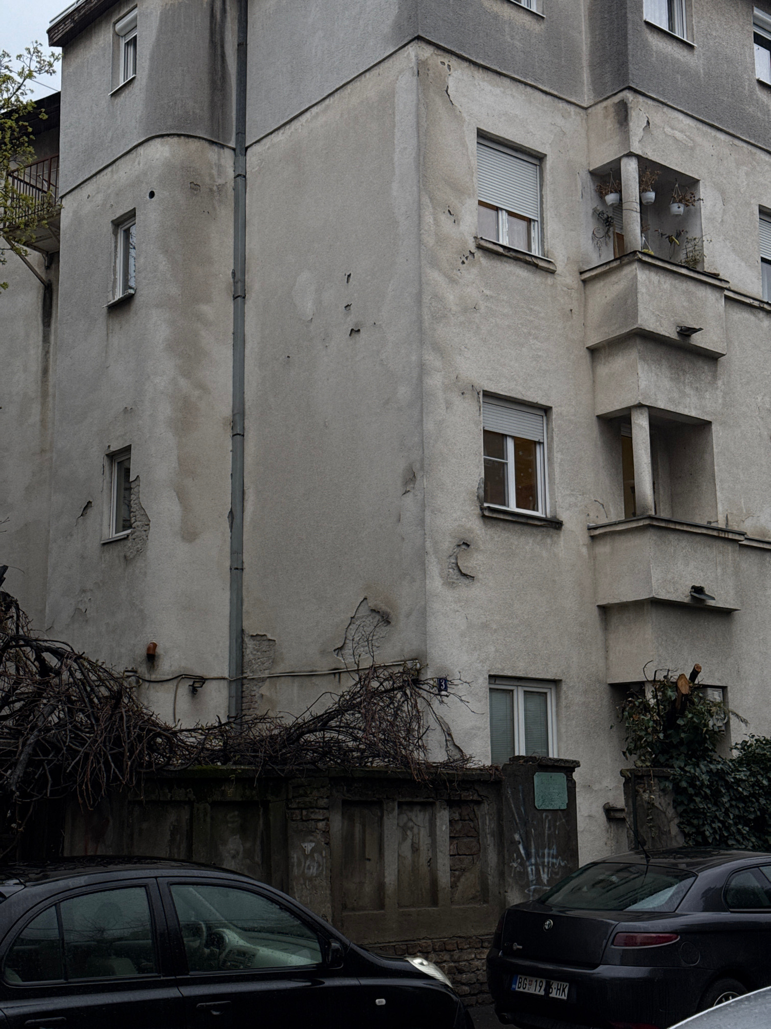 The image shows a grey, aging apartment building in Palilula Urban Municipality, Serbia. The architecture features protruding, boxy balconies and recessed windows. The building's facade exhibits peeli…read more