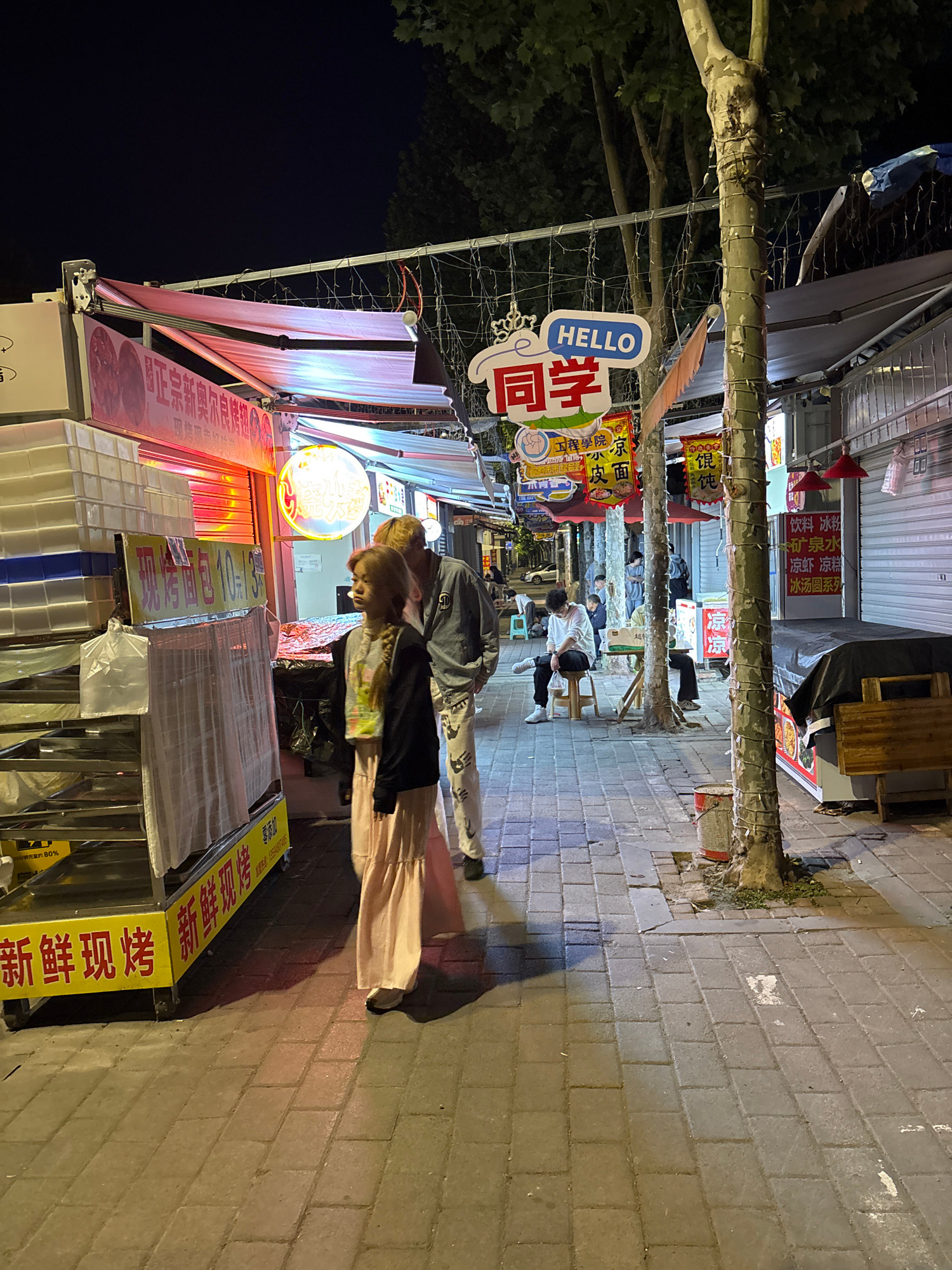 Here is a detailed description of the image: **Overall Scene:** The image depicts an outdoor food stall scene in Jiangjin, China, at night. The stalls line a paved sidewalk. **People:** There are s…read more