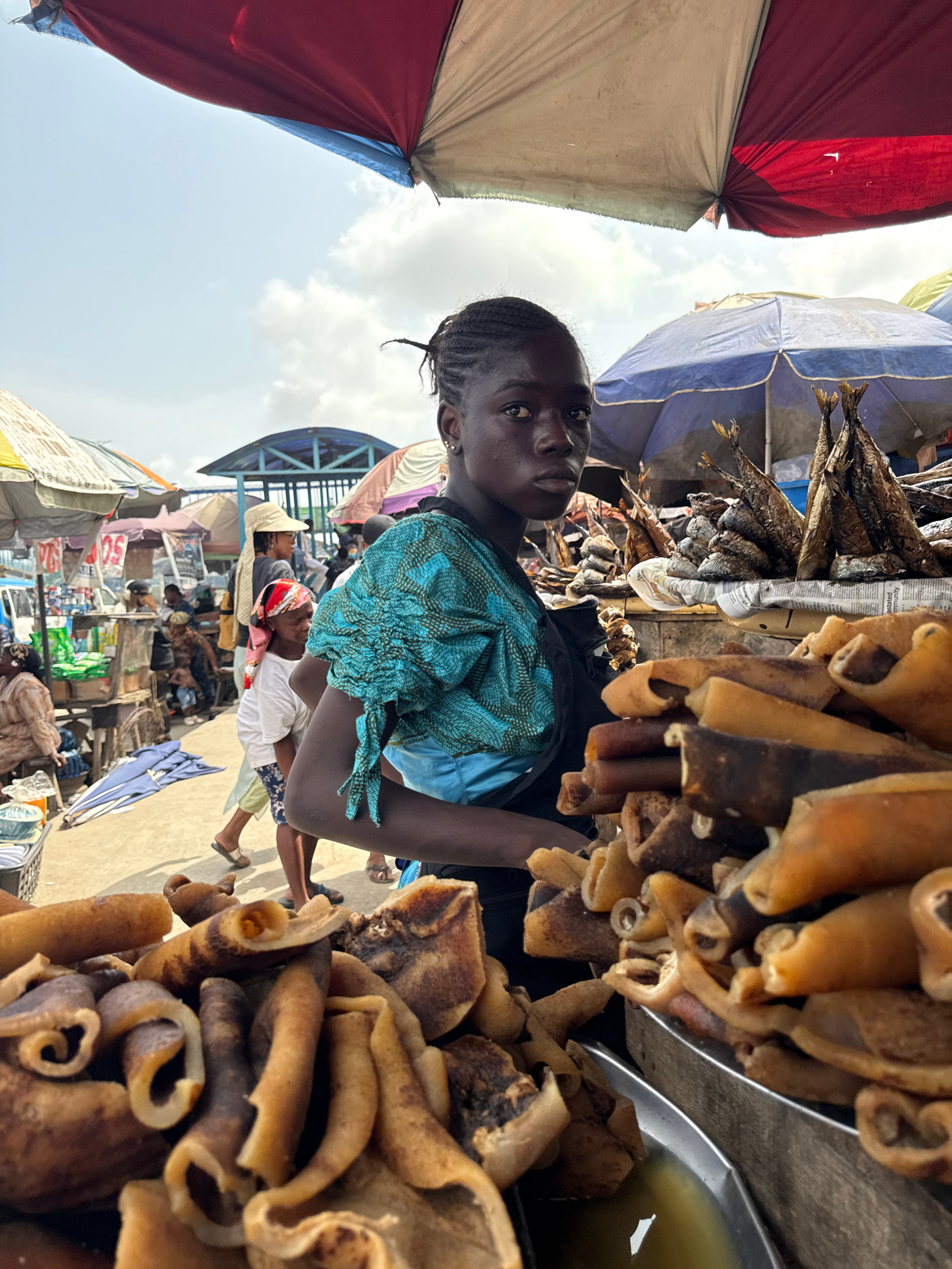 The image depicts a young person standing at a market stall in Lekki, Nigeria. The individual has dark skin and wears a blue patterned top. They are surrounded by a variety of goods for sale, includin…read more
