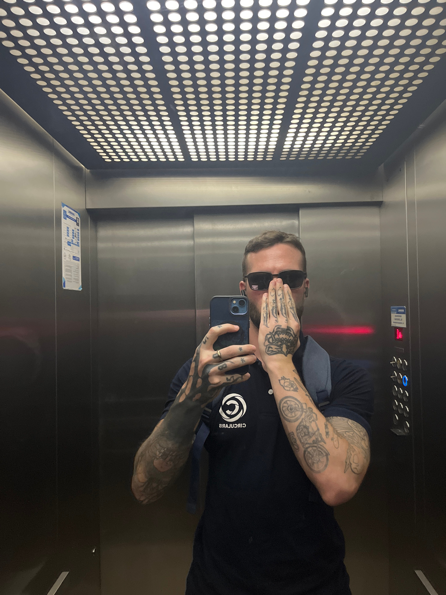 A man is taking a selfie in an elevator. He is wearing sunglasses and a dark blue t-shirt with a white circular logo. He has extensive tattoos on his arms and hands. The elevator has a metal interior…read more