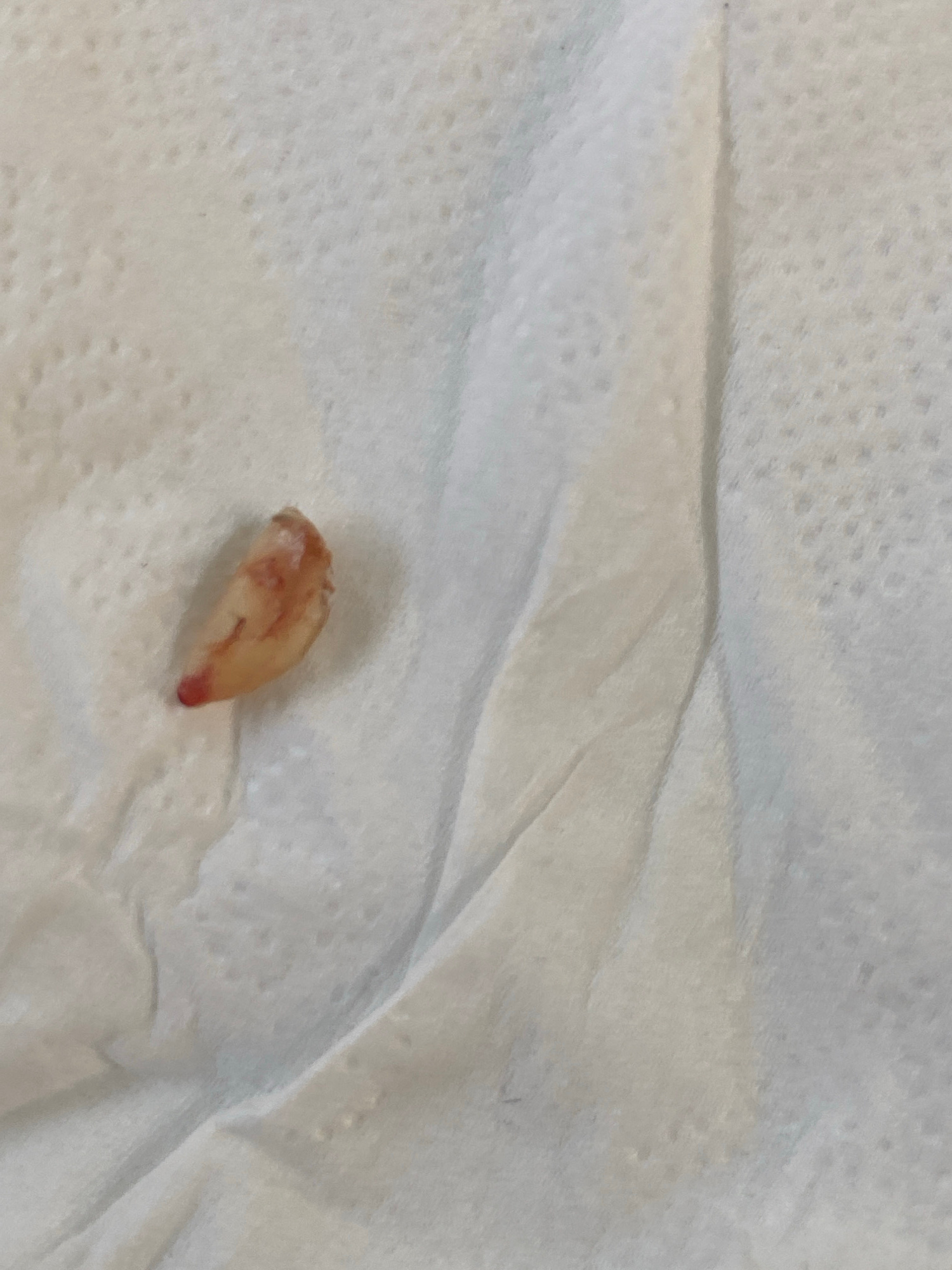 A single tooth is centered on a wrinkled, white tissue. The tooth is light tan with red streaks and a red tip. The background is plain. There is no indication of the location being Barden Yana, Nigeri…read more