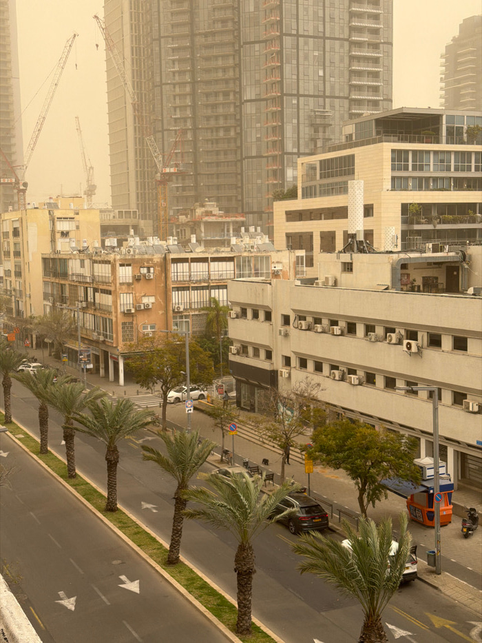 The image depicts an urban street scene in Tel-Aviv, Israel, under a pervasive, uniform yellowish-brown dust haze, significantly reducing visibility. The scene is observed from an elevated vantage poi…read more