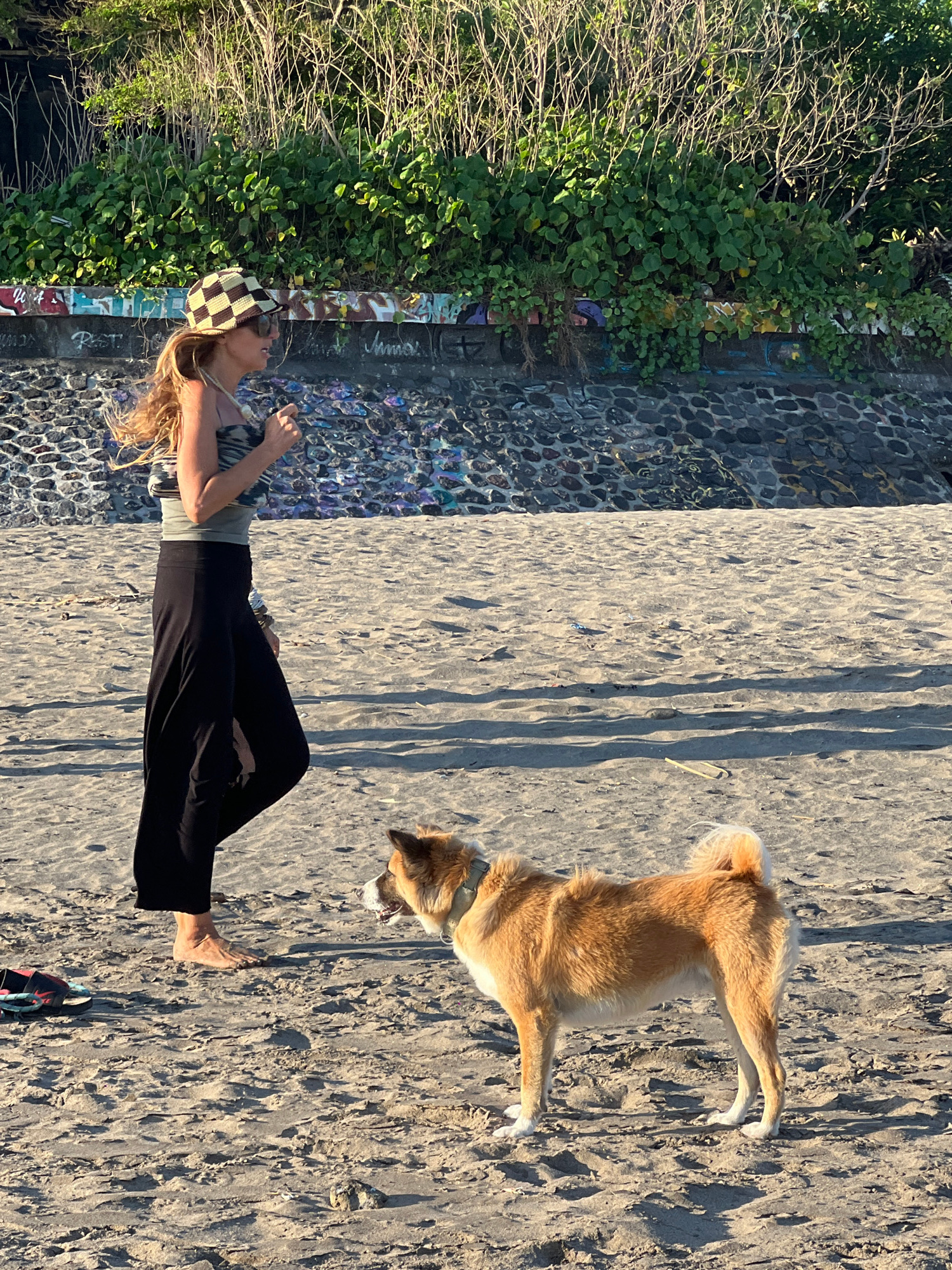 The image depicts a woman and a dog on a beach. The woman, wearing a checkered hat and dark clothing, is lying down near a wall with vegetation. A light-colored dog lies to her right, also on the beac…read more