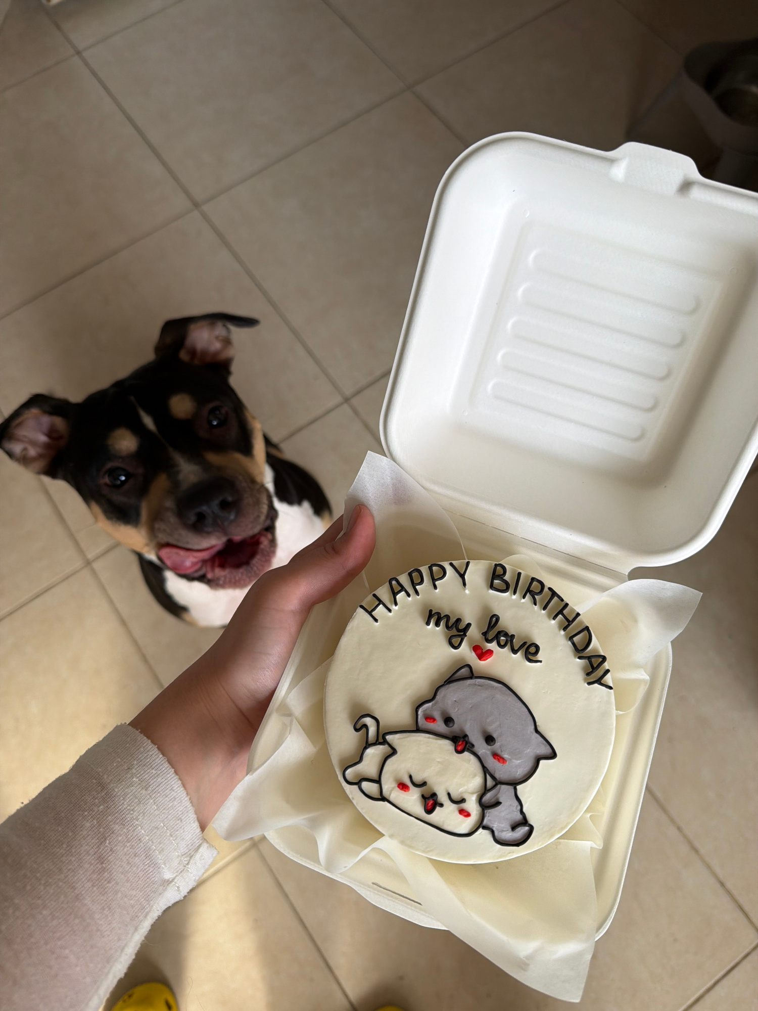A high-angle, indoor shot shows a person holding a small cake with an illustration of two cartoon cats in a white box. The cake is round with white frosting, and a message written in black icing reads…read more