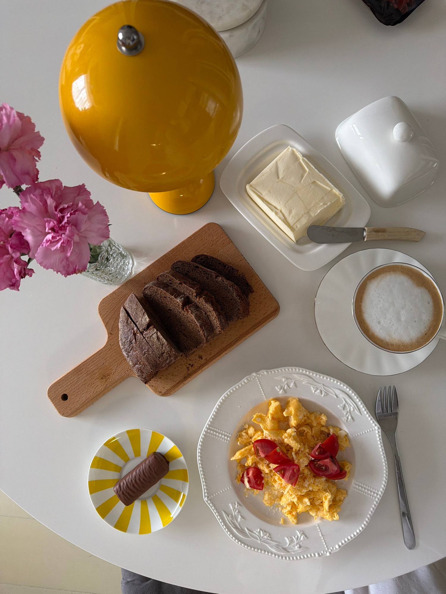 This overhead shot captures a table set for a meal, likely breakfast or brunch, in Khimki, Russia. The white table surface is laden with various food items and tableware, suggesting a domestic setting…read more