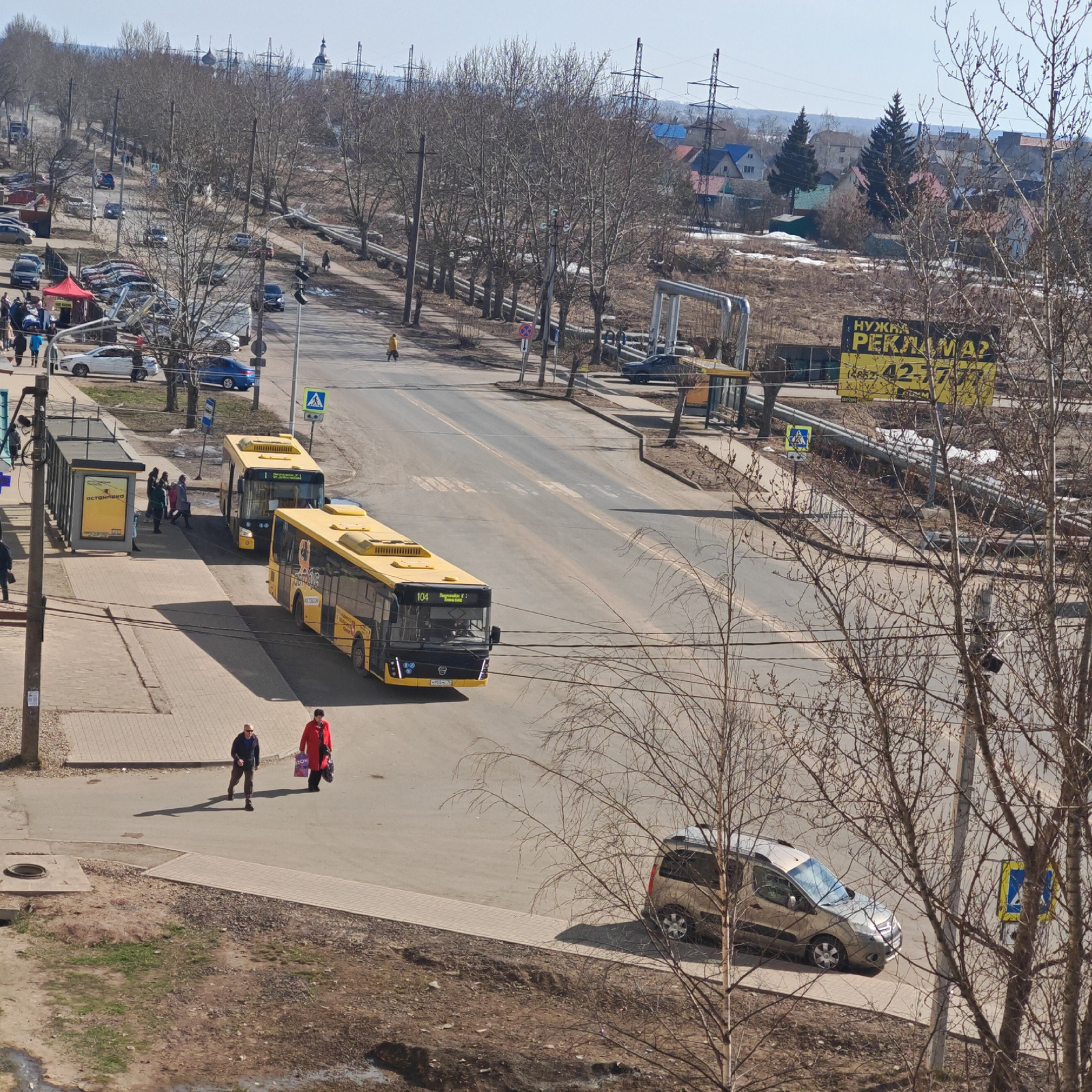 The image shows a street scene in what appears to be the city of Rostov, Russia. Two yellow buses are visible on the road, one closer to the camera with the number "104" displayed on its front. People…read more