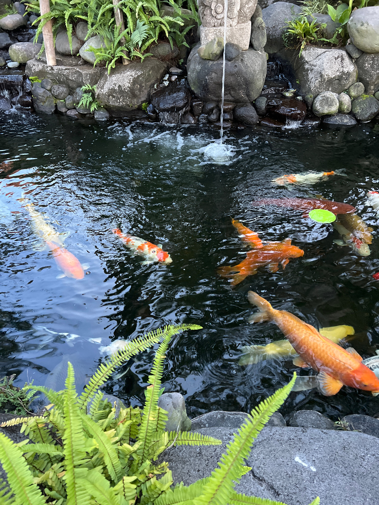 The image captures a koi pond in Ubud, Indonesia, exhibiting an assemblage of vibrant koi fish. The pond is surrounded by rocks and lush ferns, creating a naturalistic environment. A small waterfall f…read more