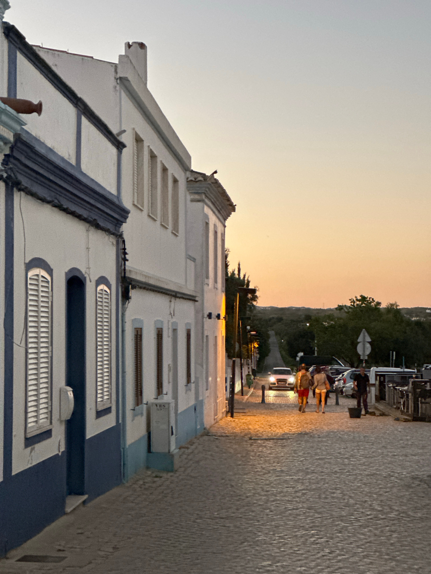 This image captures a view from a street in Vila Real de Santo António, Portugal, at dusk or dawn. The foreground shows a row of white buildings with blue trim, a common architectural style in the reg…read more