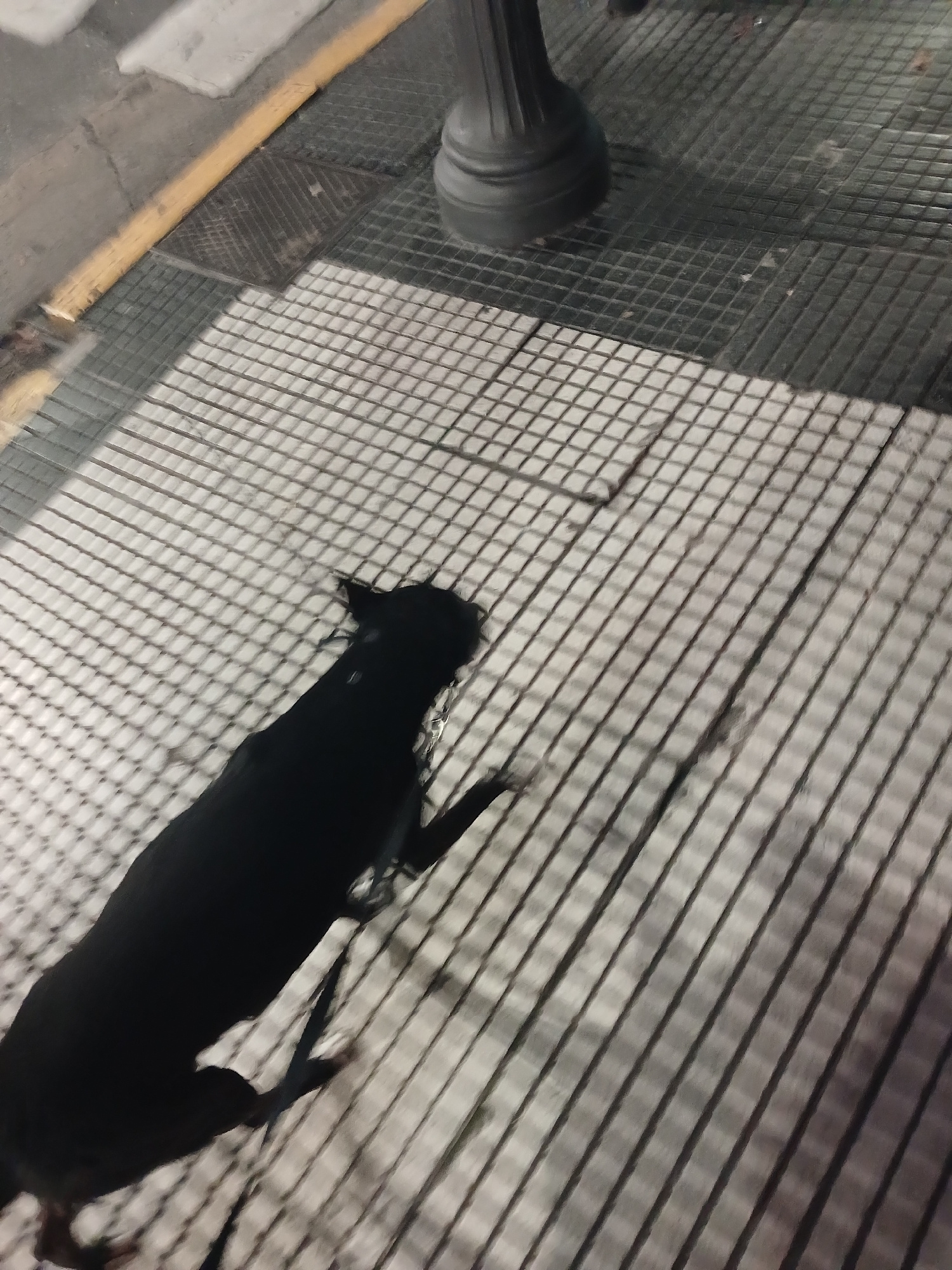 The image, captured from a high-angle, downward perspective with a tilted orientation, depicts an outdoor urban setting in Buenos Aires, Argentina. The scene focuses on ground surfaces and shadows ca…read more