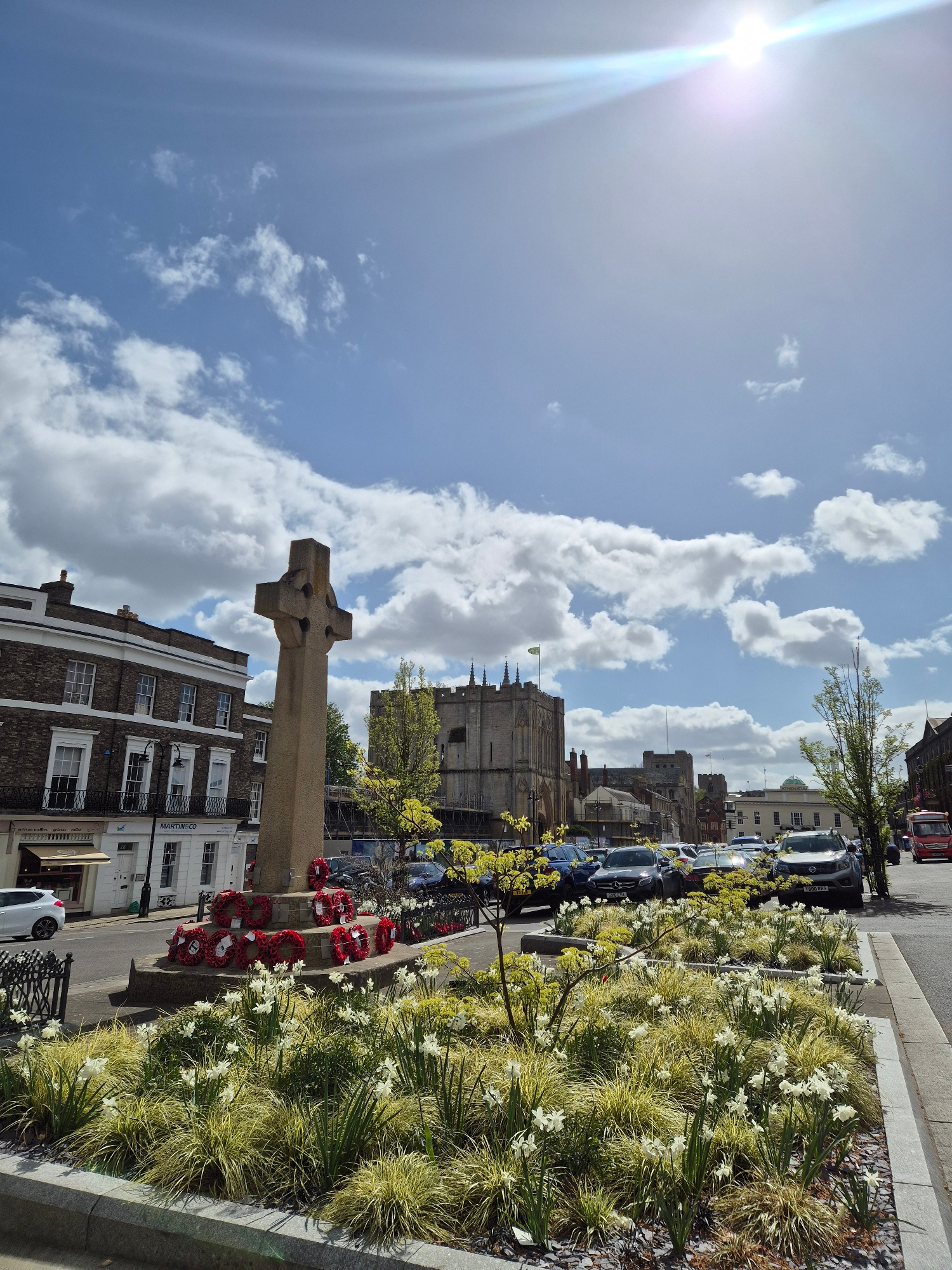 This photo depicts a street scene with a Celtic cross war memorial in the foreground, likely in a town within West Suffolk, UK. The memorial is adorned with several red poppy wreaths. Behind the memor…read more