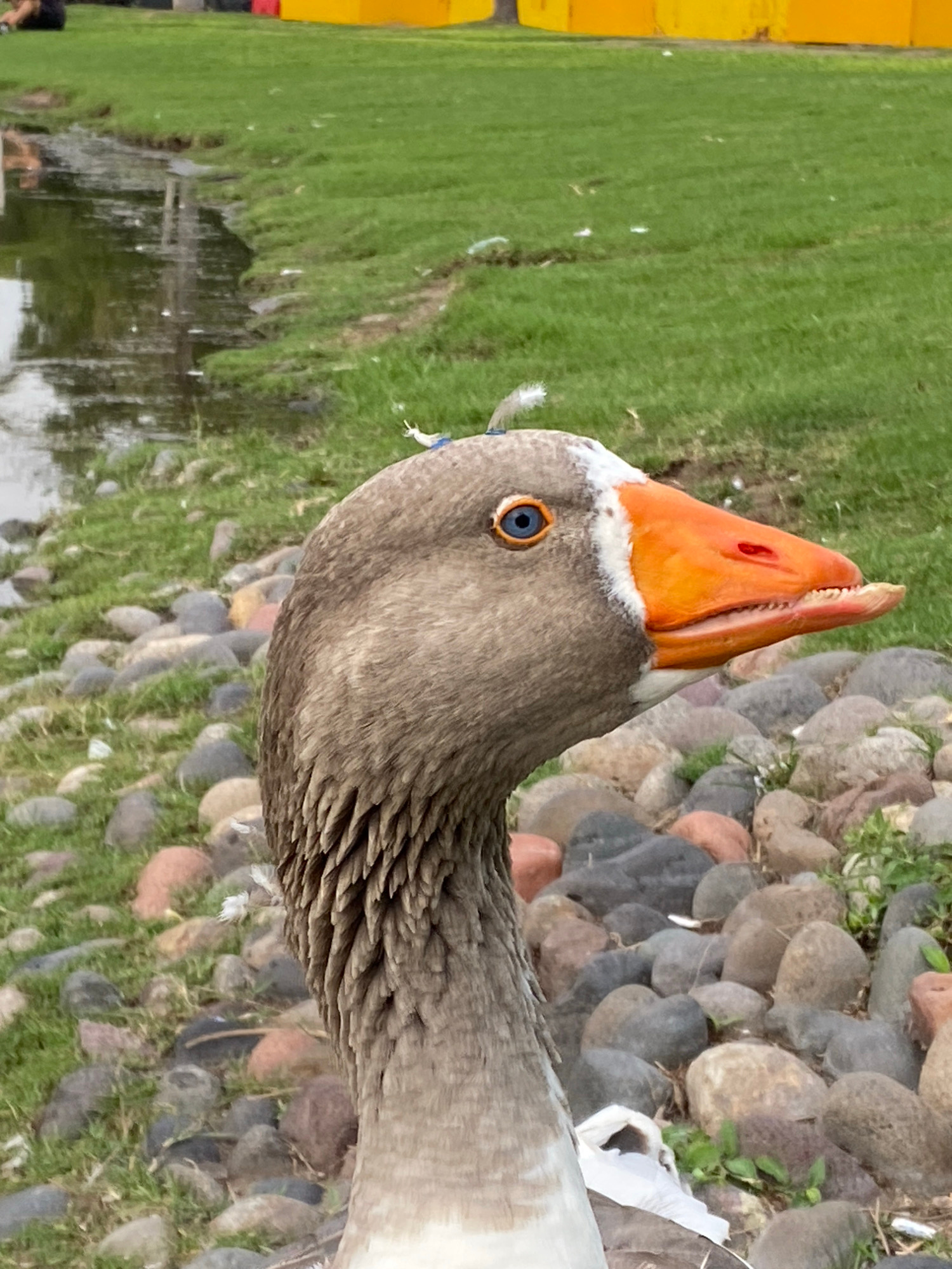 A close-up, eye-level, rotated view depicts the head and upper neck of a greylag goose on a grassy area interspersed with rounded stones. The goose has brown plumage on its head and neck, an orange be…read more