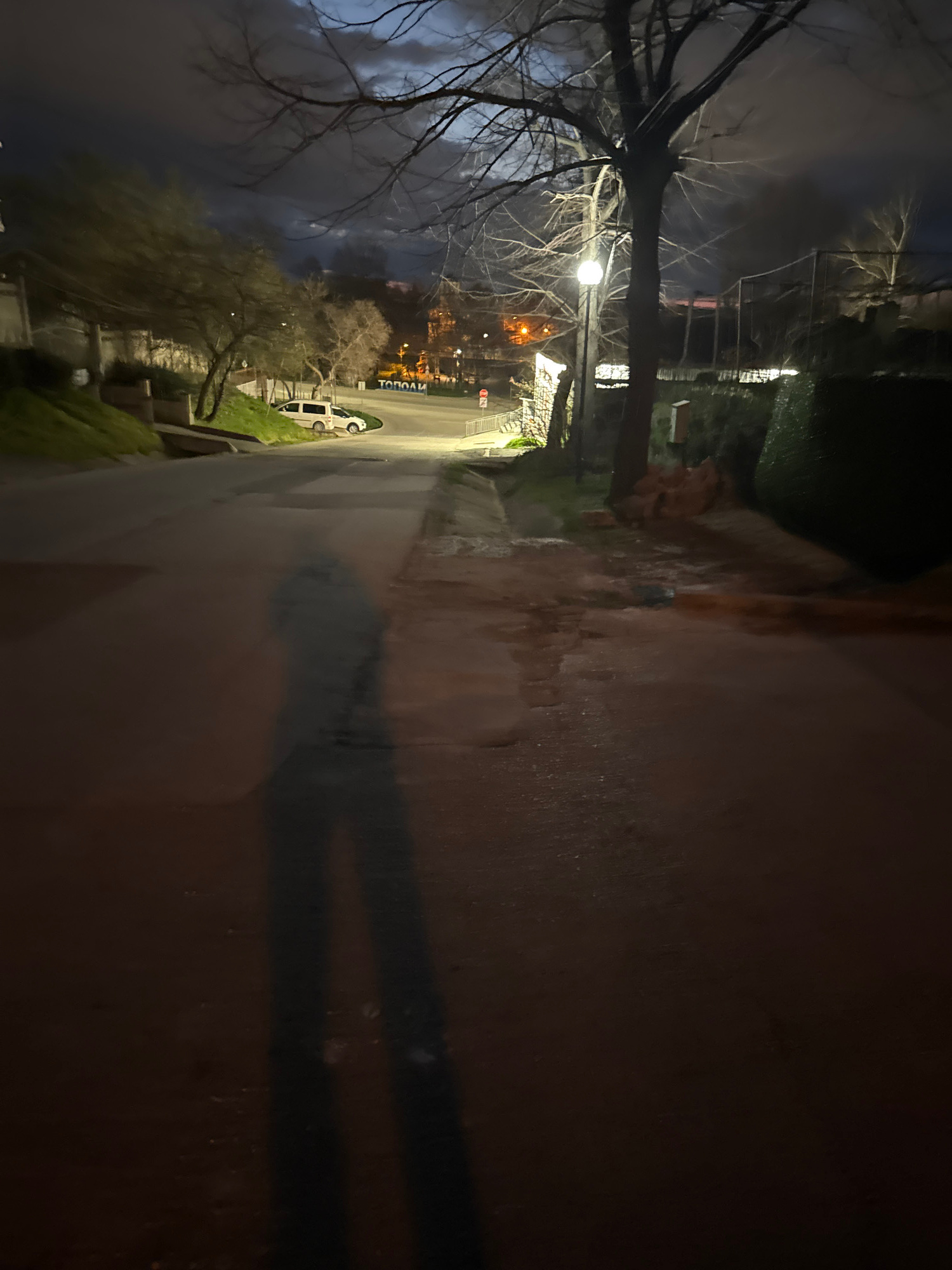 The image shows a street scene in Topoli, Bulgaria at night. A street light illuminates the street and sidewalk, casting a long shadow onto the pavement. Bare trees are visible to the left, silhouette…read more