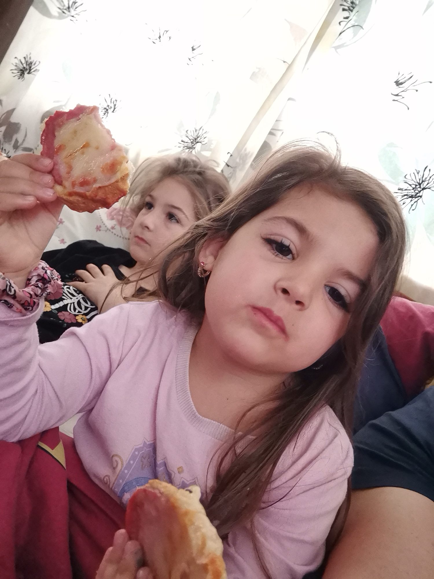 Two young girls are indoors, likely on a couch or bed, eating pizza. The girl in the foreground holds a partially eaten piece of pizza in her right hand. She has brown hair, a pink long-sleeved shirt,…read more