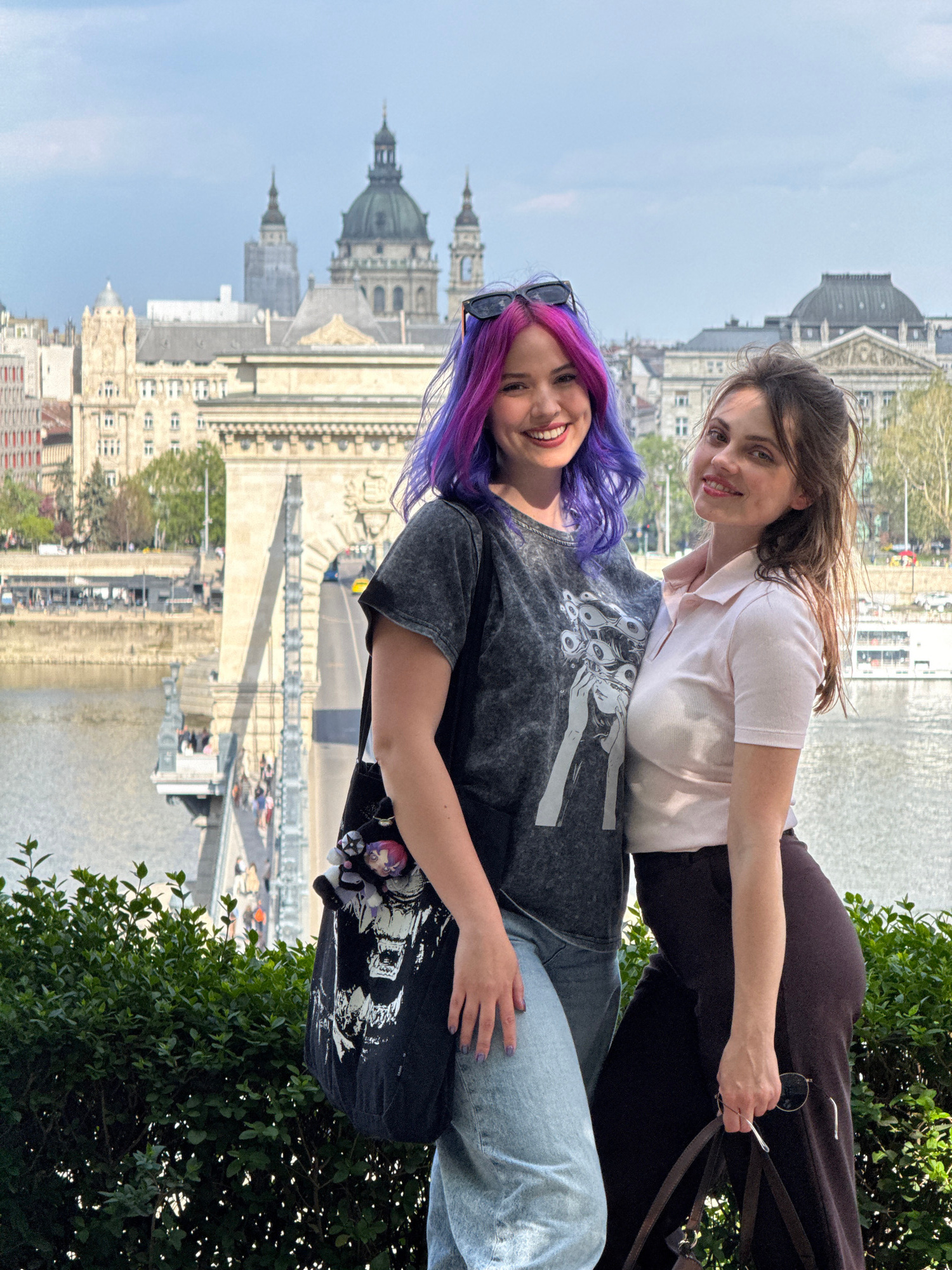 Two young women are captured in a bright, outdoor portrait, smiling at the camera from what appears to be an elevated viewpoint overlooking a city. The image is oriented vertically (originally rotatedβ¦read more