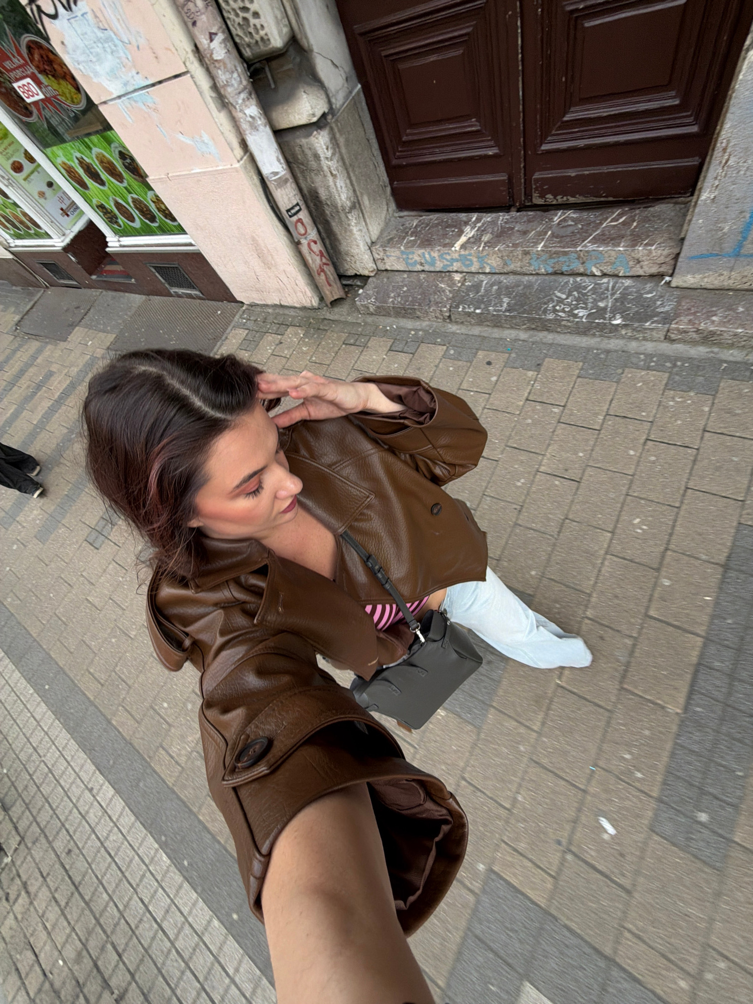 The image shows a woman standing on a paved sidewalk next to a building in Belgrade, Serbia. The woman is wearing a brown leather jacket, light blue pants, and a striped shirt. She has dark hair with…read more