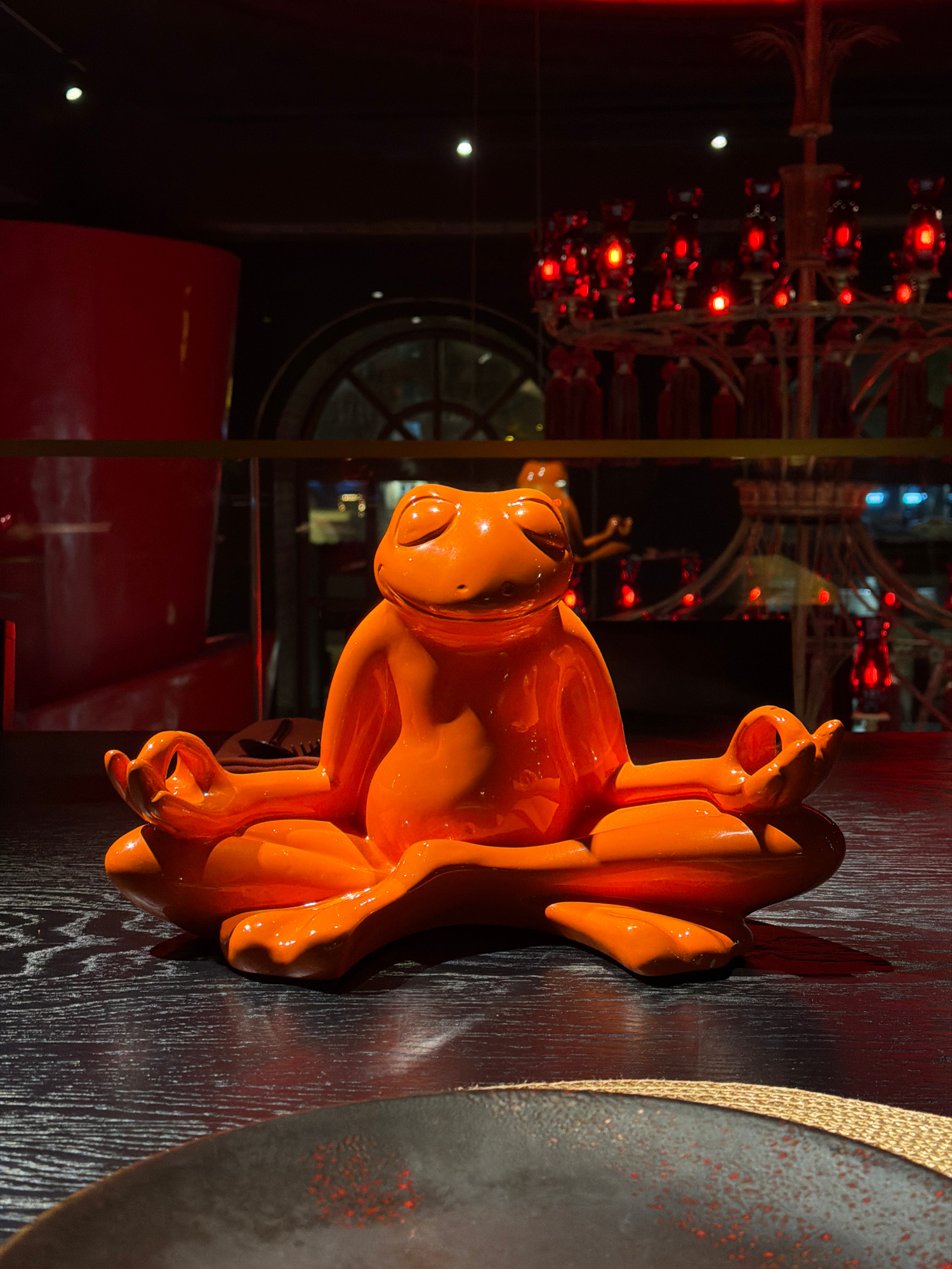 An eye-level indoor shot shows a glossy orange frog figure atop a dark, wood-grained surface. The frog has an anthropomorphic quality, with one hand gesturing in a circular shape above its head, while…read more