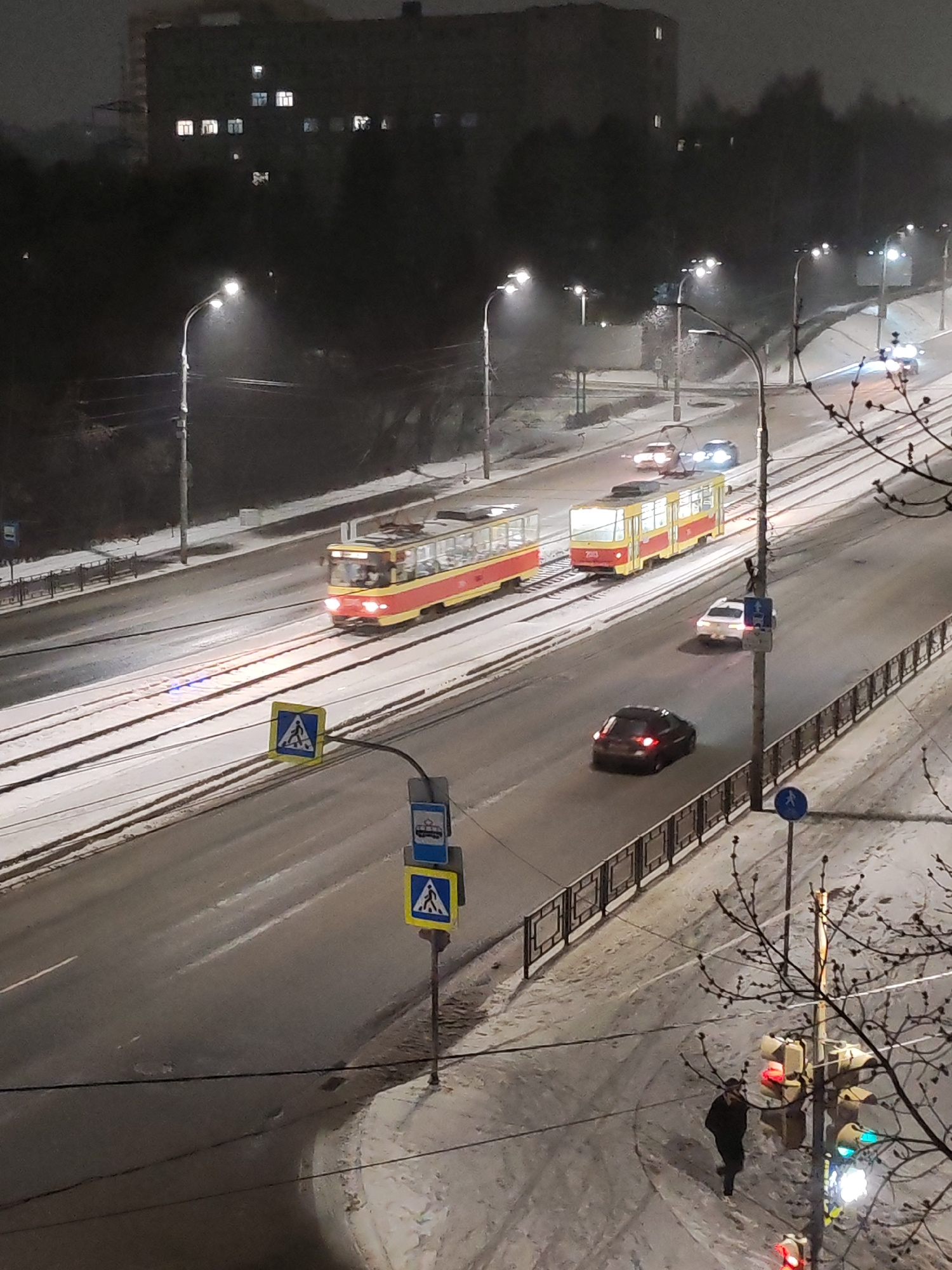 The image depicts a nighttime scene in Izhevsk, Russia, during winter. Two red and yellow trams are traveling on rails that run parallel to a road with multiple lanes of traffic. Cars are driving on t…read more