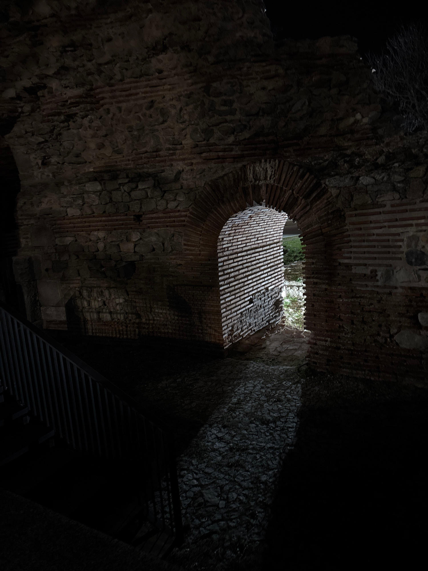 The image depicts an interior view of a Roman ruin in Hisarya, Bulgaria. The structure is primarily constructed of brick and stone, with an archway featuring a brick-laid ceiling. A stairwell is visib…read more