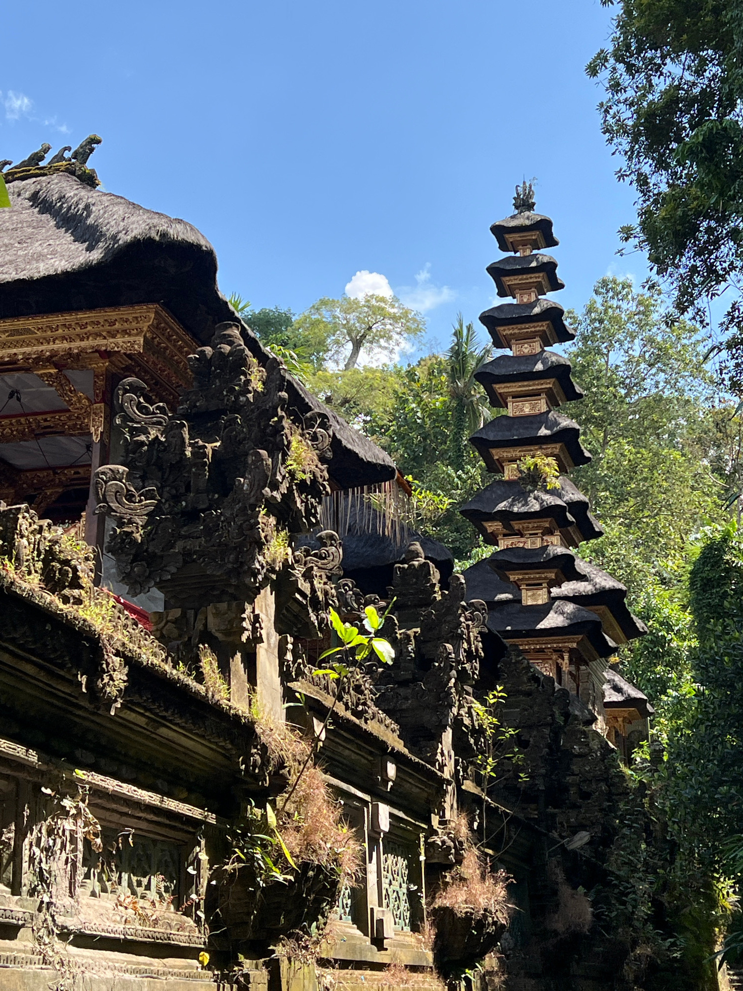 This image depicts a traditional Balinese temple structure, likely located in or near Ubud, Indonesia, known for its rich cultural heritage and numerous temples. The temple architecture is characteriz…read more