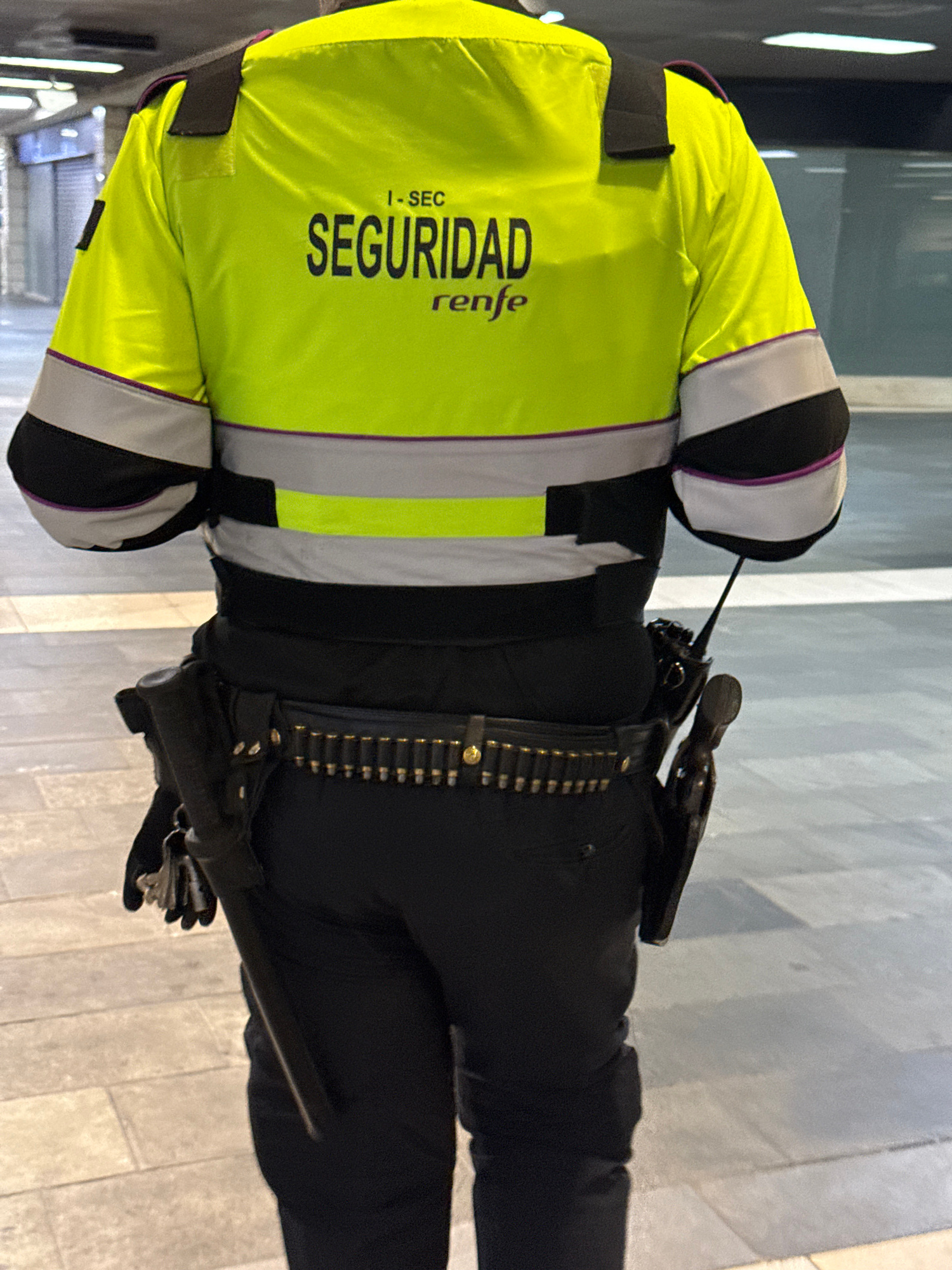 The image shows the back of a security guard wearing a bright yellow jacket with "SEGURIDAD renfe" printed on it. He is also wearing a black belt with ammunition cartridges, a gun holster, and a baton…read more