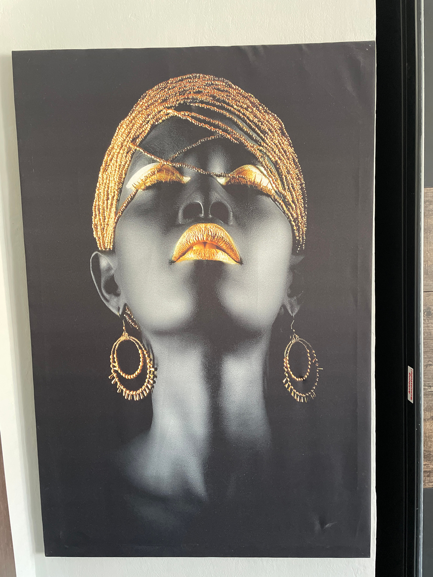 A portrait of a Black woman in grayscale is set against a solid black background. She has gold braids framing her head and gold lipstick on her lips. Gold earrings are dangling from her ears. The port…read more