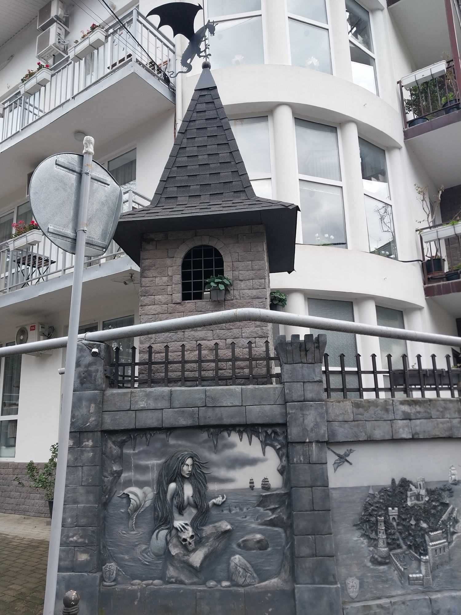 The image shows a whimsical building structure in Sochi, Russia, featuring a turret-like extension with a pointed roof and a weather vane shaped like a dragon. The structure is adjacent to a modern bu…read more