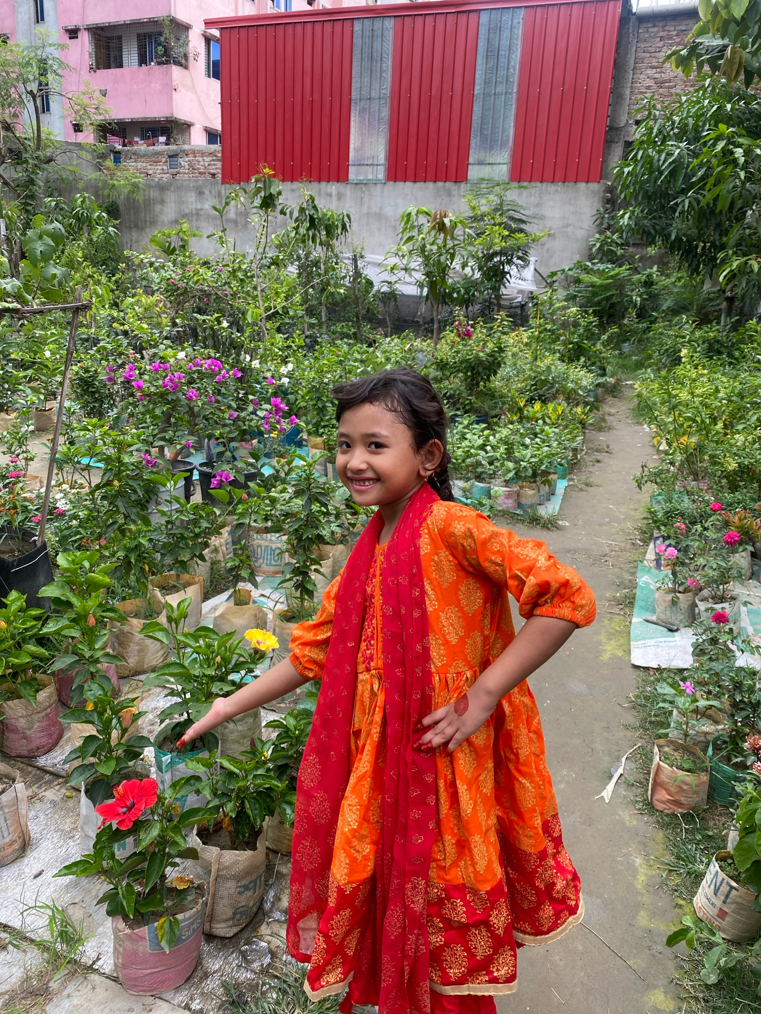 A young girl in an orange and red dress with gold patterns is outside tending to flowers. She is slightly bent over with her hand reaching toward a red hibiscus flower. She is smiling at the camera. T…read more