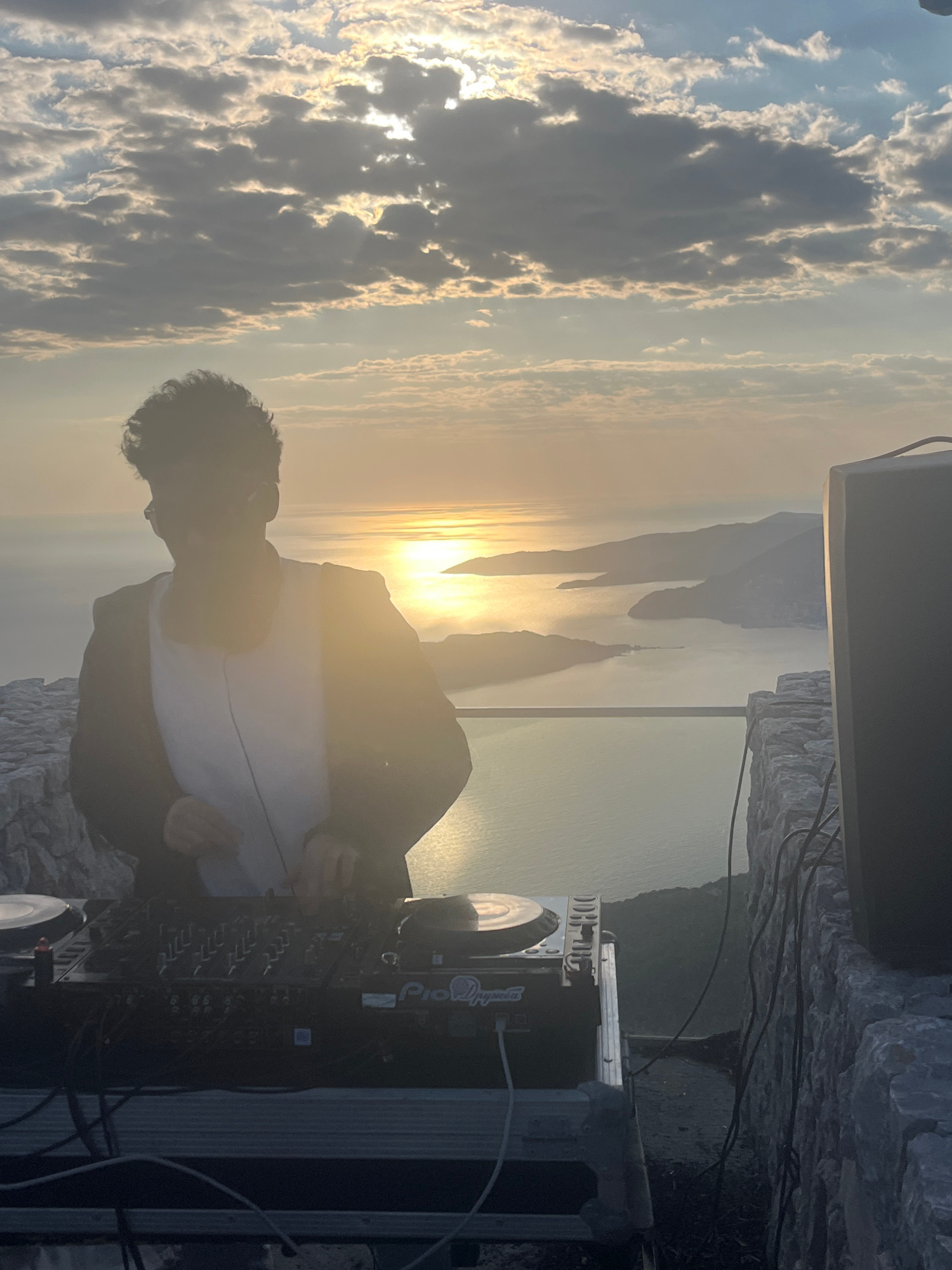A medium shot shows a person operating a Pioneer DJ mixer set up outdoors on a rocky cliff. The person is facing the mixer and has their hands on it. The person wears a dark jacket over a white shirt.…read more