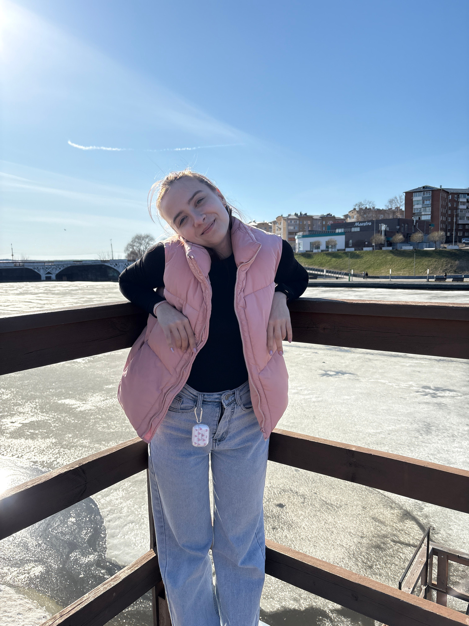 A young woman is captured in a bright outdoor portrait, leaning on a dark wooden railing. She has light-colored hair and a gentle smile, looking directly at the camera. She is wearing a light pink puf…read more