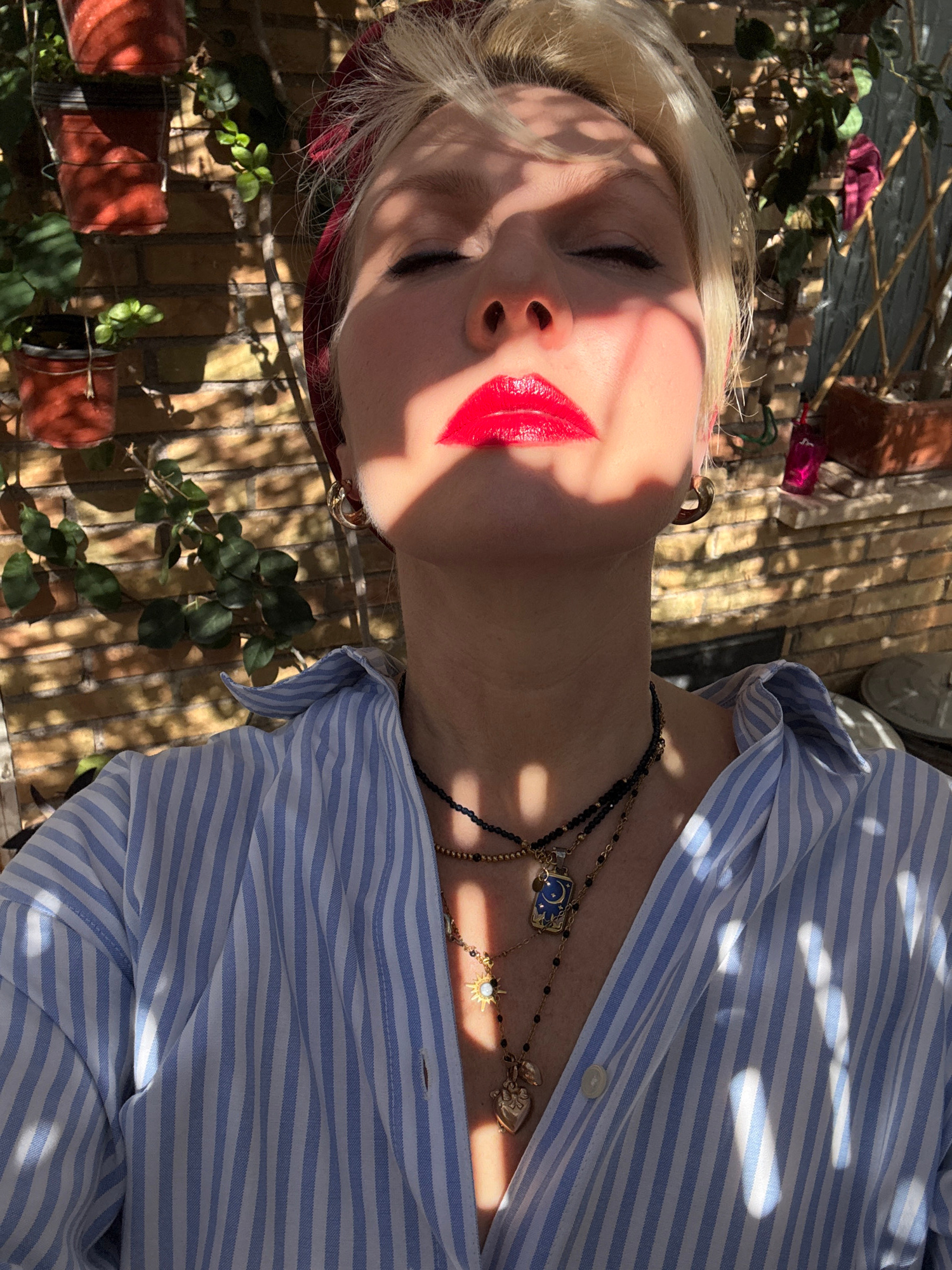 A medium, low-angle shot depicts a person with fair skin and platinum blonde hair wearing a blue-and-white striped collared shirt and several necklaces with pendants. The person's eyes are closed and…read more