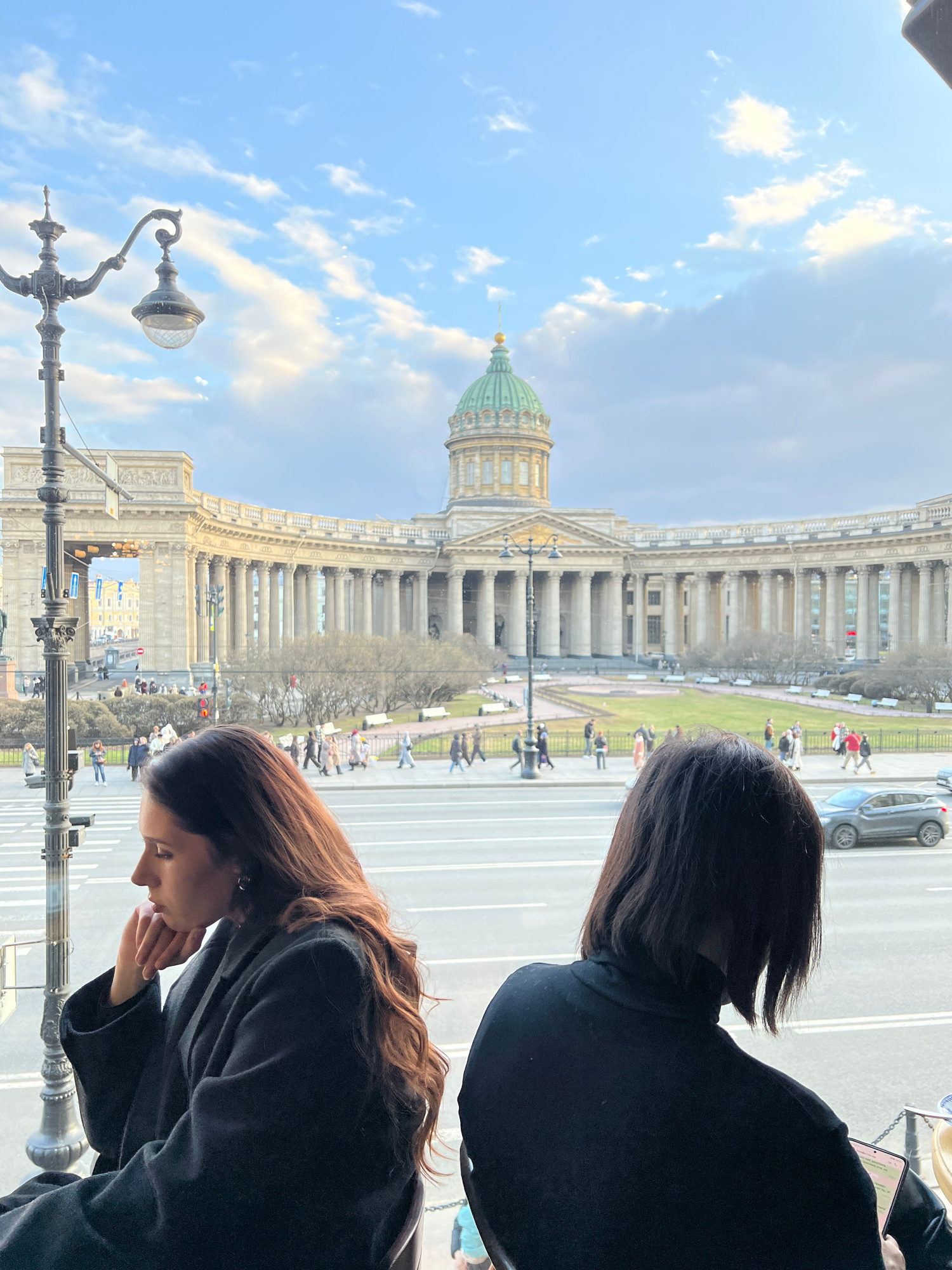 The image shows a view of Kazan Cathedral in Saint Petersburg, Russia, seen through a window from an elevated perspective. Two people are partially visible in the foreground, likely standing inside a…read more