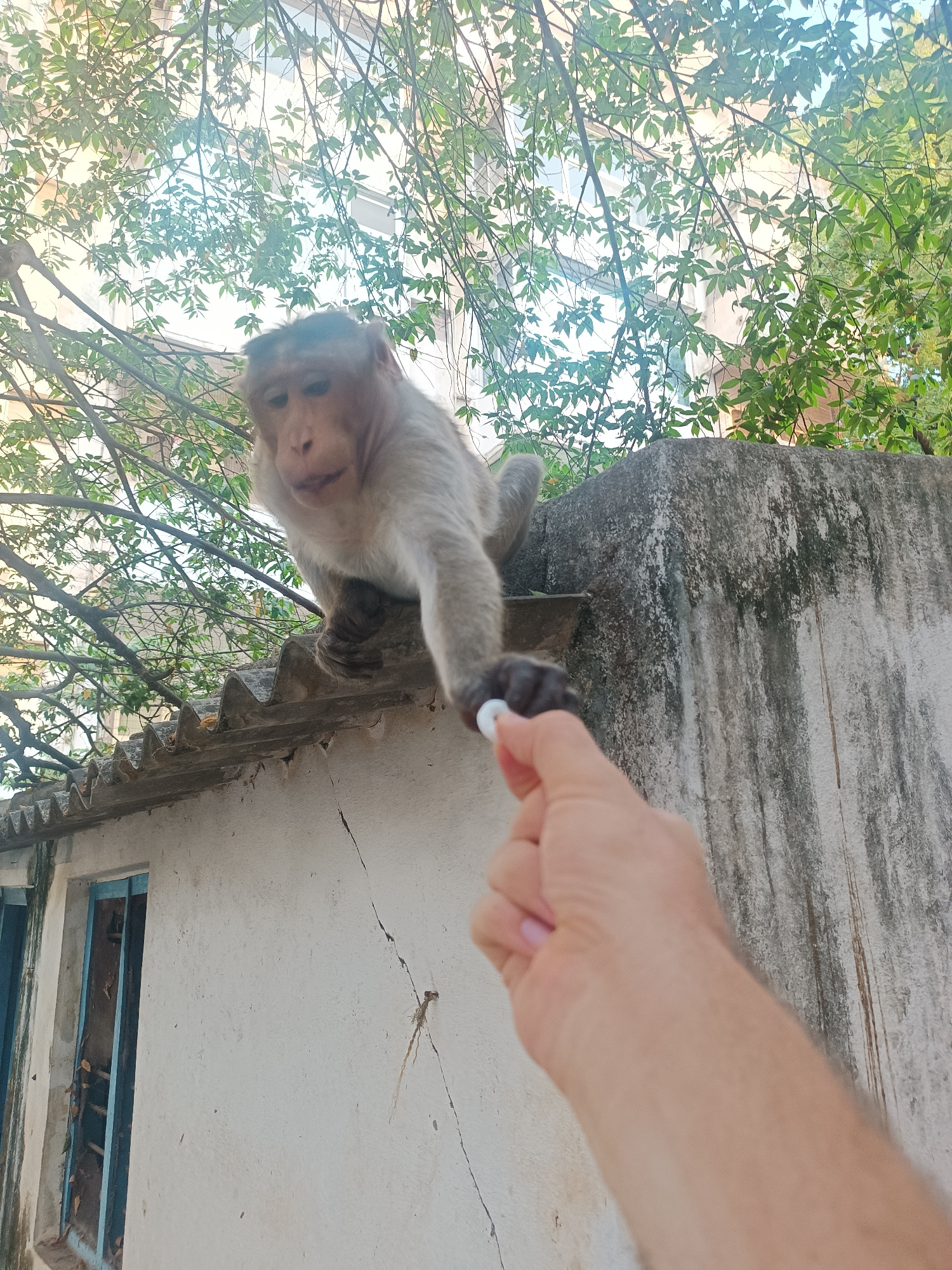 A medium shot depicts a monkey on a weathered concrete structure, extending its hand to receive a white object from a human hand. The monkey is light brown with darker facial features and has a curiou…read more