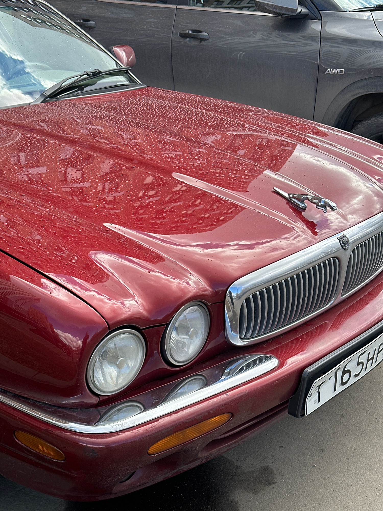 A close-up, slightly angled shot focuses on the front of a dark red Jaguar sedan, with a chrome grill featuring a hood ornament and headlight bezels with the car's hood covered in water droplets. A gr…read more