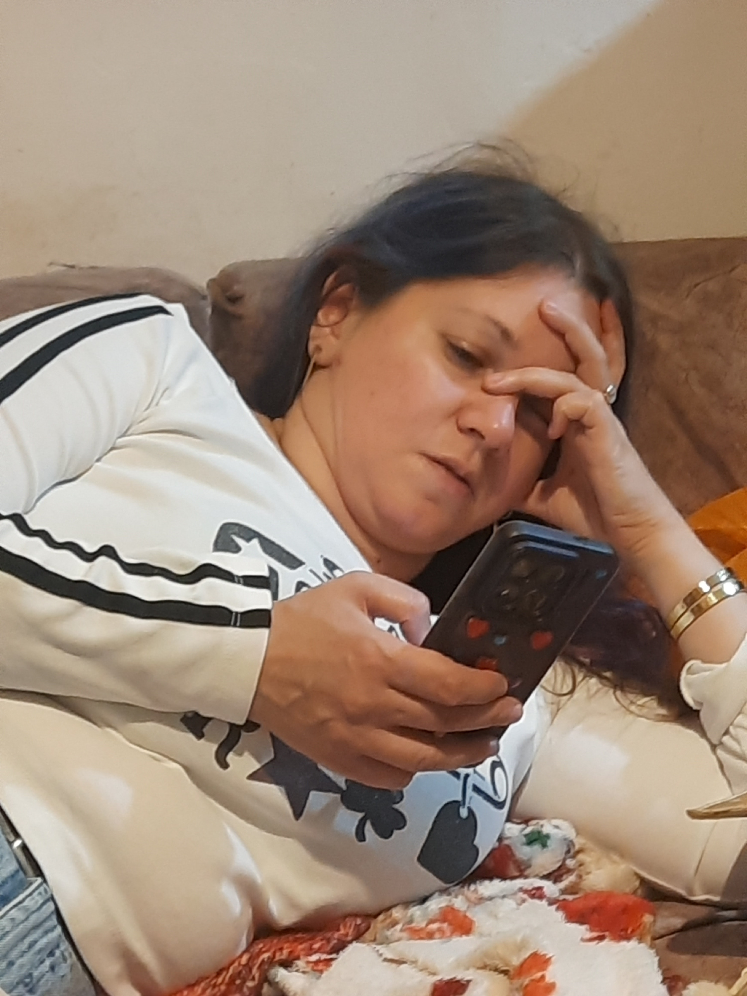 A woman with dark hair is lying on a brown couch. She's wearing a white, long-sleeved shirt with black stripes down the sleeves. Her left hand is on her forehead while she holds a black phone case dec…read more