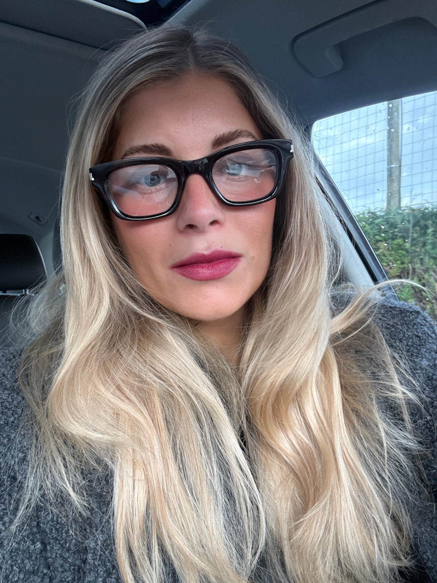 A woman with long blonde hair is seated in a car. She is wearing black-framed glasses and red lipstick. The window is visible with raindrops on the glass. The background shows greenery outside the car…read more