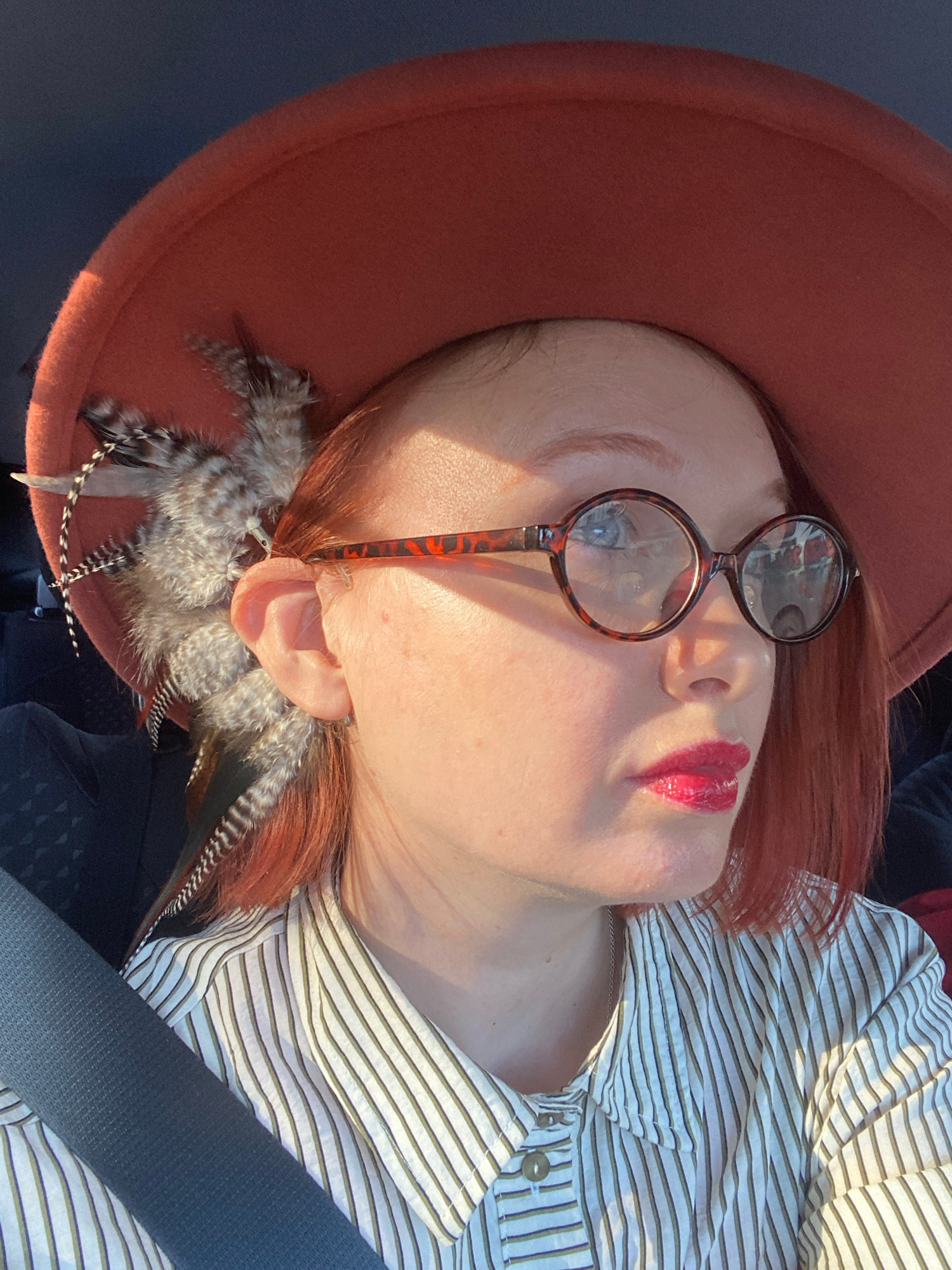 This close-up portrait, taken in Yekaterinburg, Russia, features a person, likely female, with reddish-brown hair, positioned with their head tilted to the right. They are wearing a wide-brimmed, reddβ¦read more