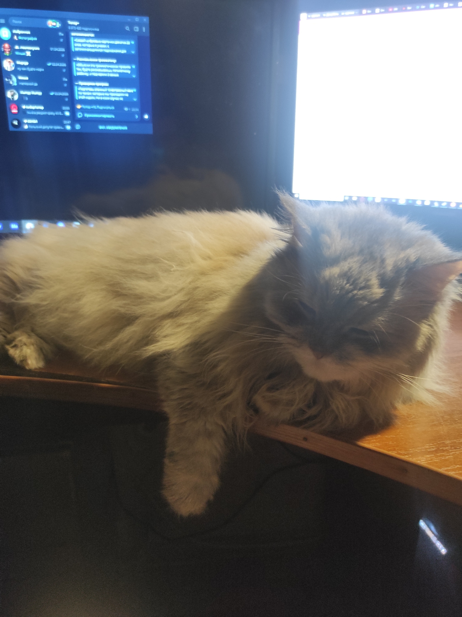 A fluffy, light-colored cat rests on the edge of a wooden desk, with one paw dangling. In the background, two computer monitors are visible. One monitor displays a bright white screen, while the other…read more
