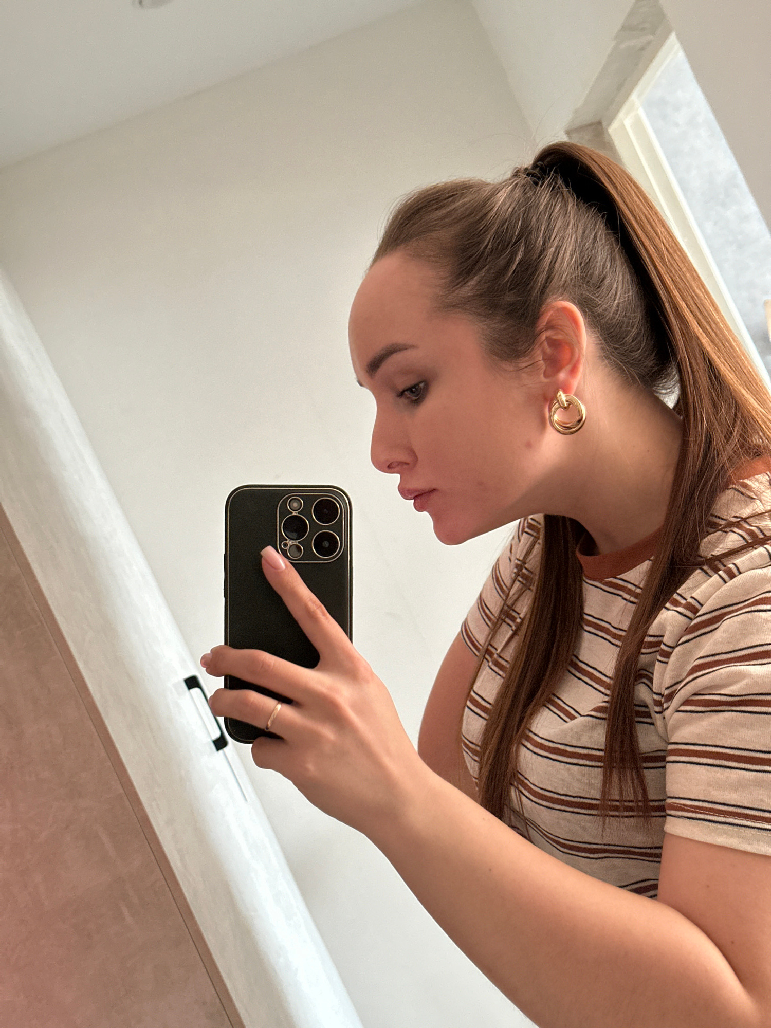 A woman takes a selfie in a bathroom. She is wearing a striped shirt and gold hoop earrings. She is holding a black smartphone with multiple cameras. The background consists of white walls and a parti…read more