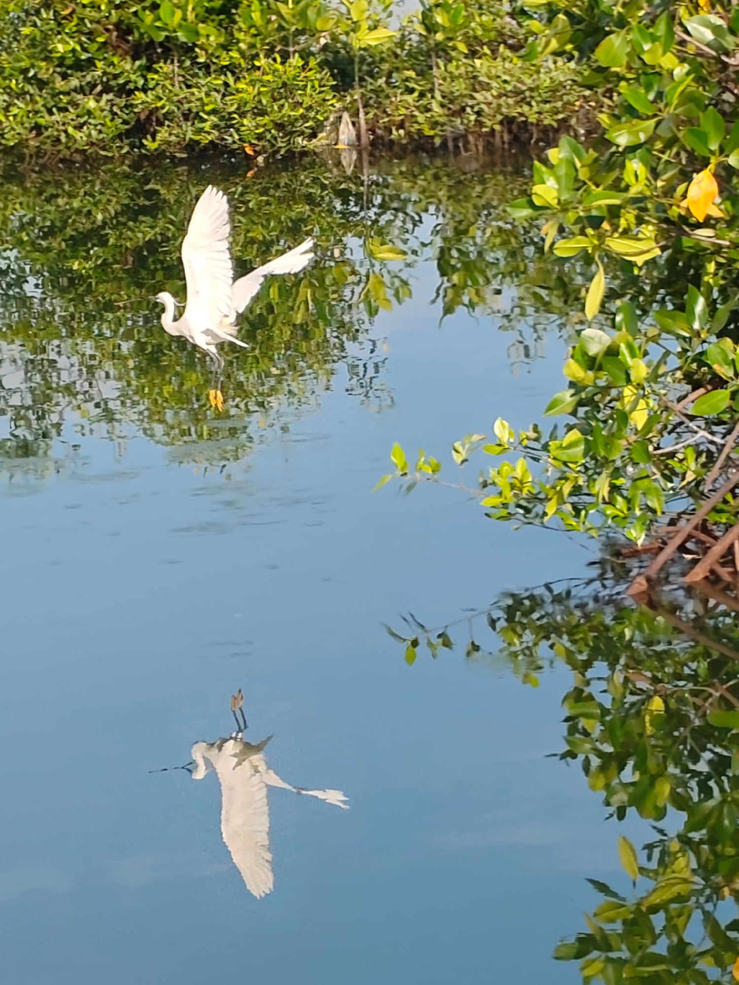 A white bird is captured mid-flight over water, with its reflection visible below. The bird has its wings spread and its feet extended. Vegetation, likely trees or shrubs, lines the water's edge, with…read more