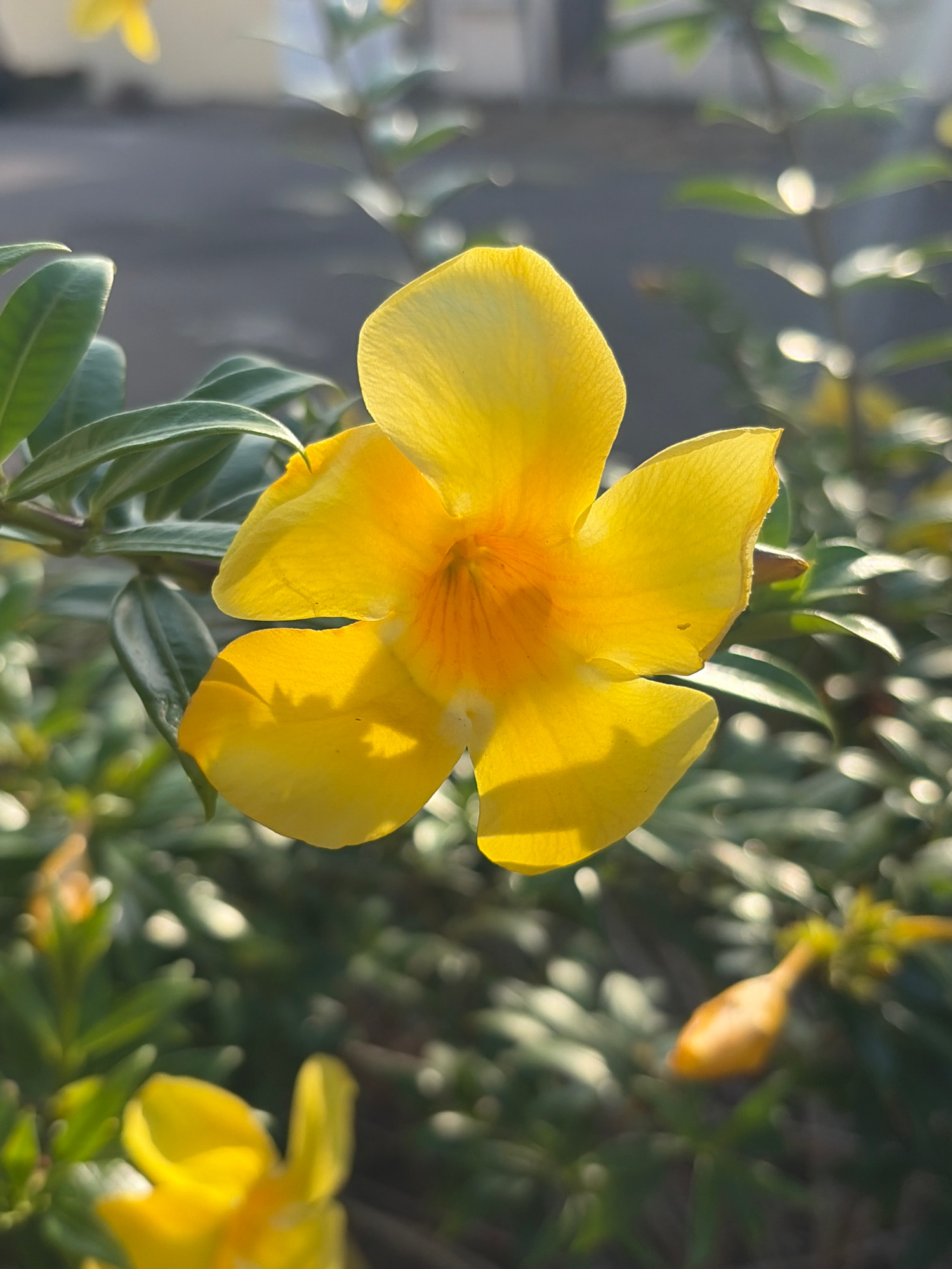 The image shows a vibrant yellow Allamanda flower in full bloom. The flower has five petals and a darker yellow center. The petals are slightly translucent and exhibit subtle variations in color due t…read more