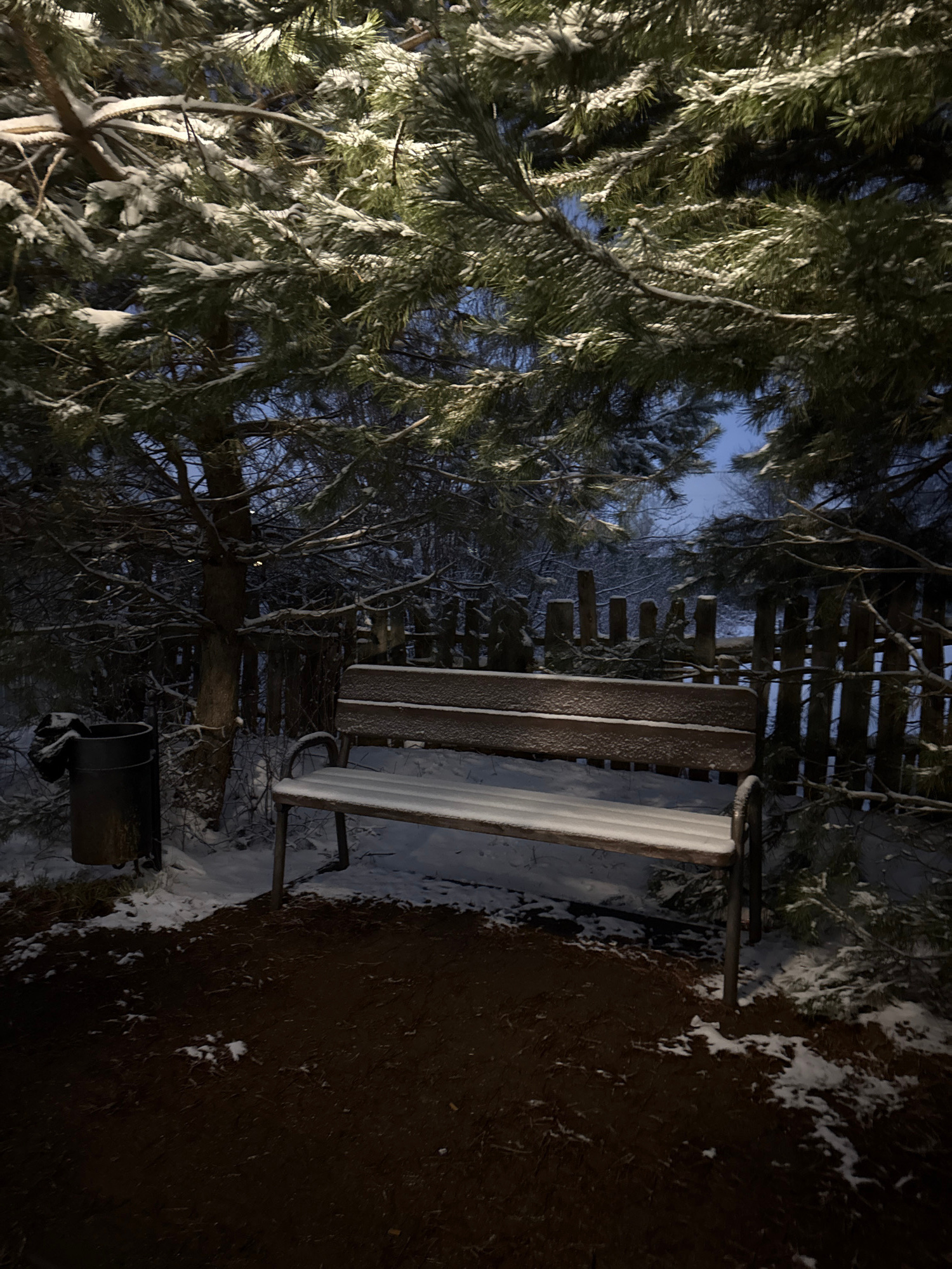 The image depicts a snow-covered park scene. A wooden bench sits beside a path or clearing. The surrounding vegetation, including pine trees and other shrubbery, is also covered in snow. A wooden fenc…read more