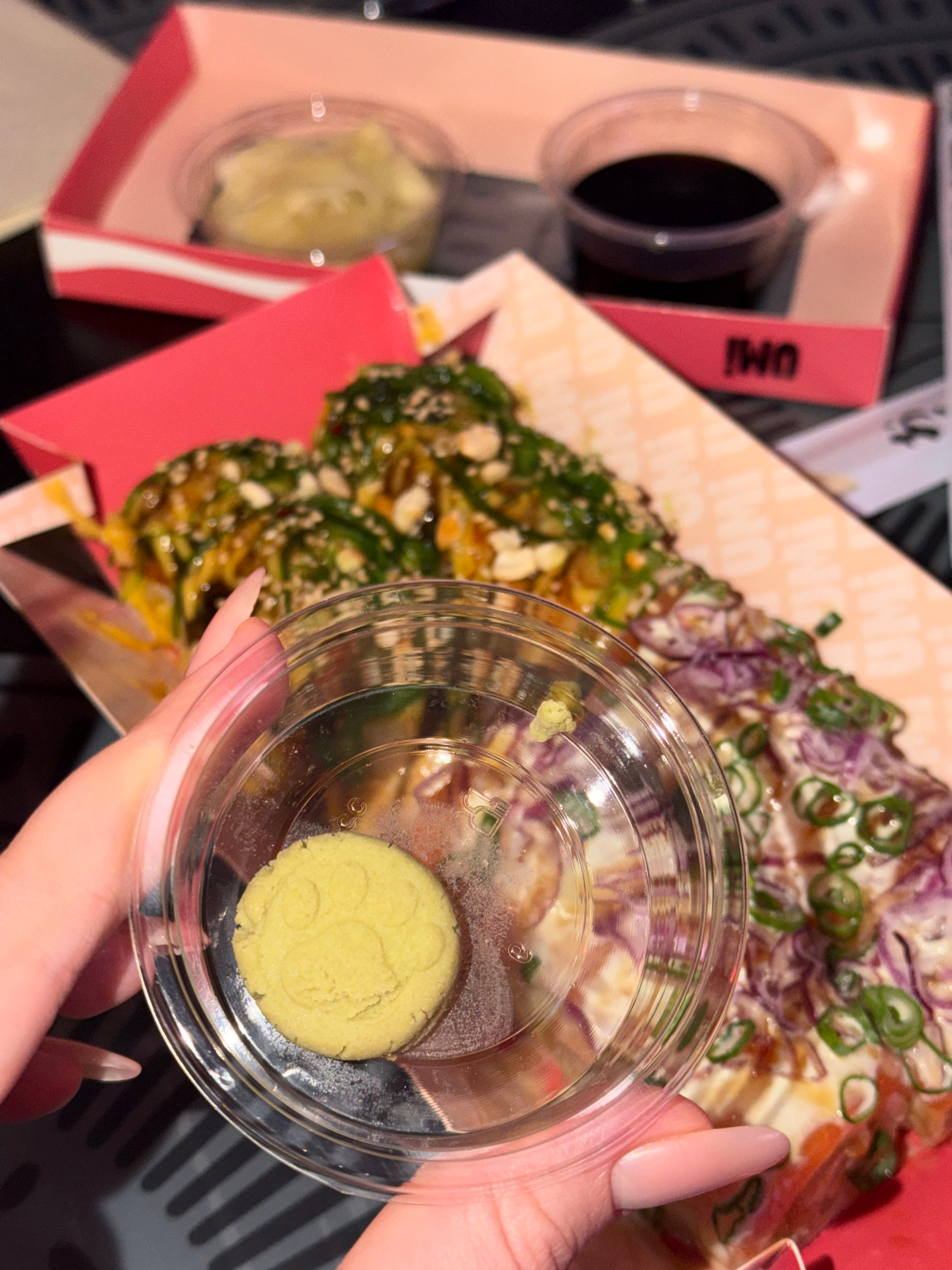 The image shows a close-up of a hand holding a small, clear plastic container with a round dollop of pale green wasabi paste inside. Behind the hand, out of focus, are parts of a takeout meal. This in…read more