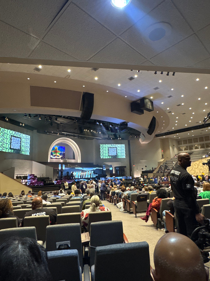 A large auditorium is filled with seated attendees facing a stage. Several large screens flank the stage, displaying "GET CONNECTED" and QR codes. A central arched structure frames a vibrant stained g…read more