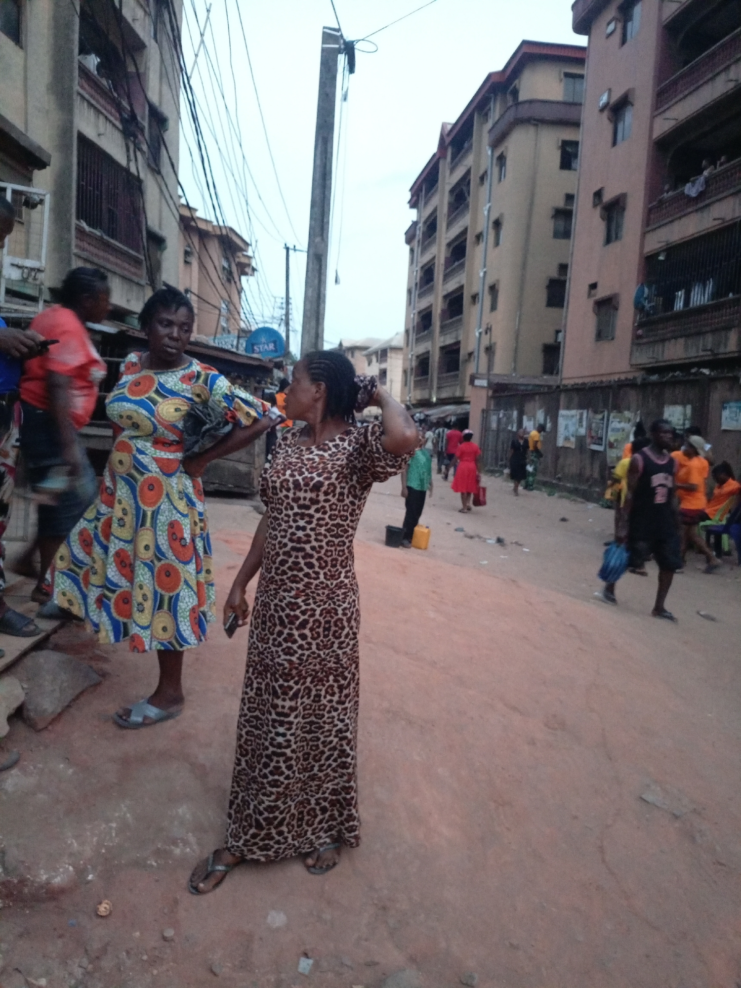 Two women stand on a sloped, dirt-covered street in Onitsha, Nigeria. The woman on the left wears a brightly patterned dress with a blue, yellow, red, and white design. The woman on the right wears a…read more